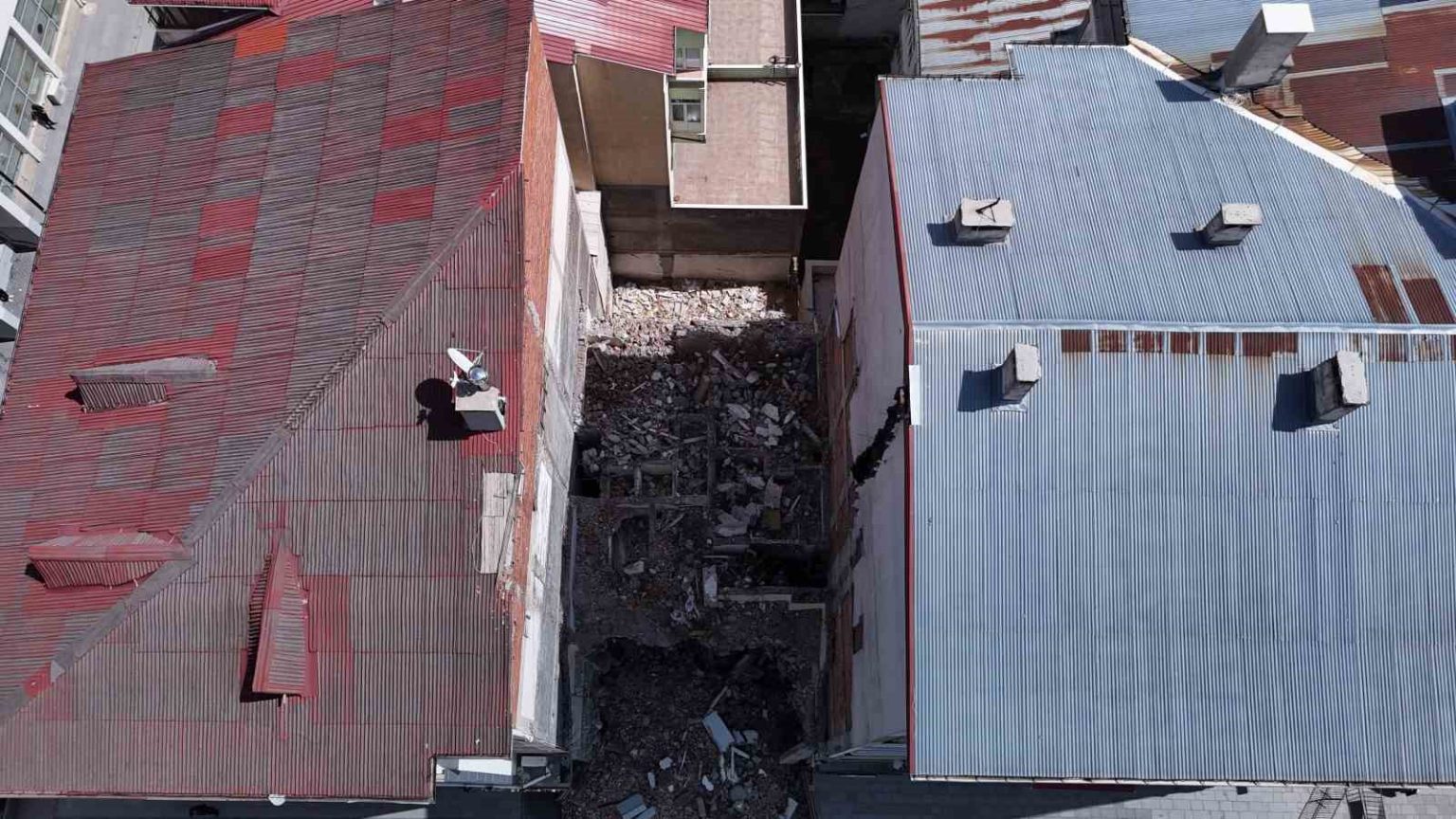 Sivas’ta yaklaşık bir ay önce bir binanın yıkımı sırasında bitişikteki binanın kolonları zarar gördü. Ağır hasarlı olarak raporlanan 21 daireli bina tahliye edilirken, yapının son durumu dron ile havadan görüntülendi.
