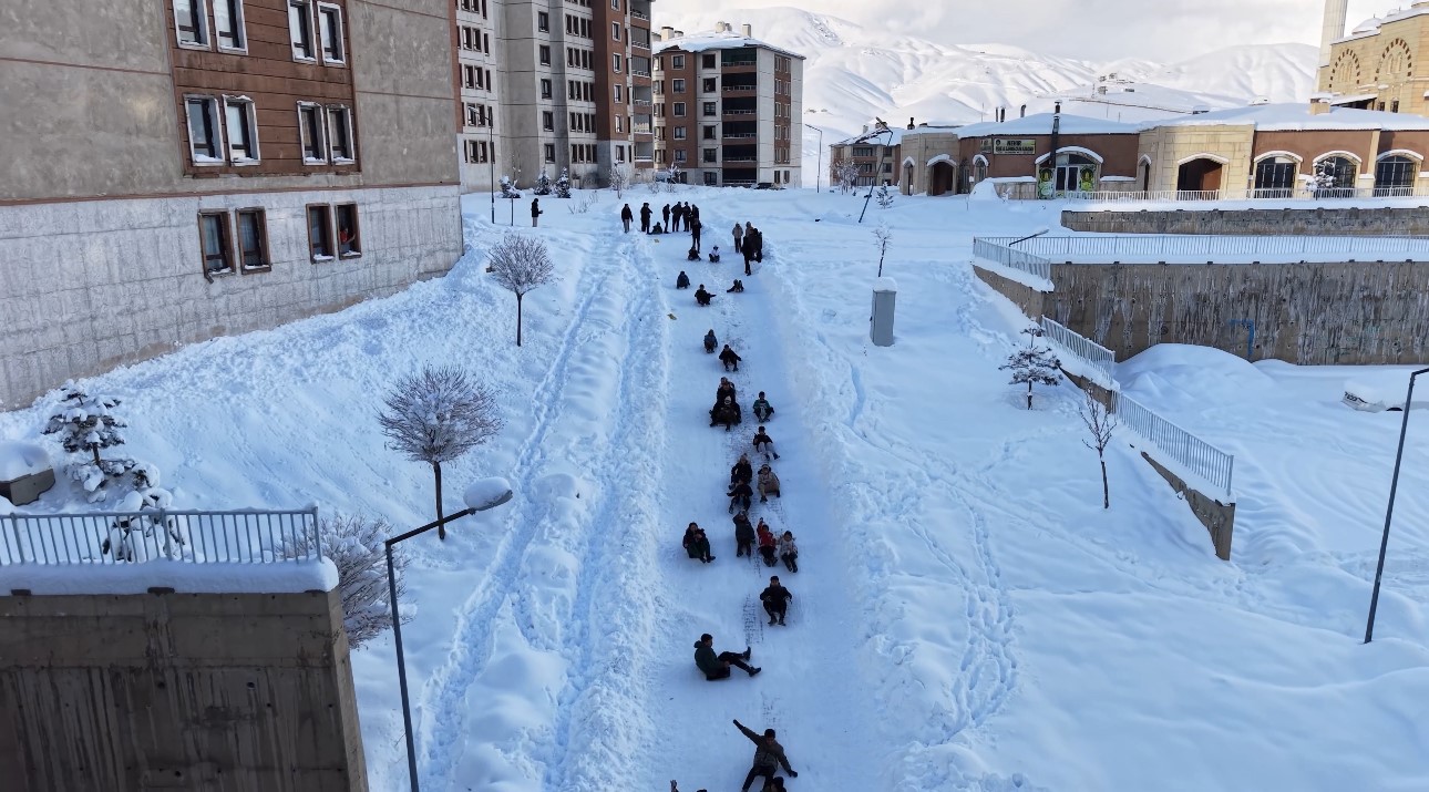 Yüksekova’da çocuklar mahalle yolunu kayak pistine çevirdi