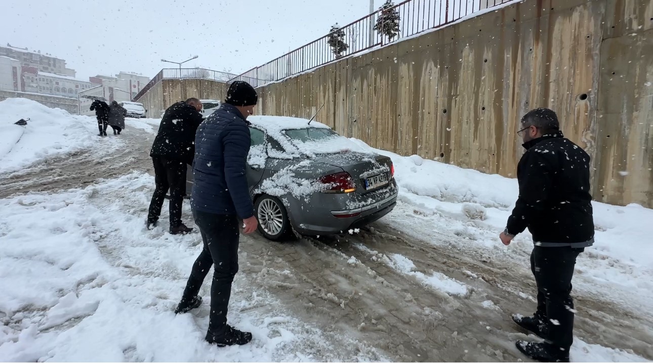Hakkari’nin Yüksekova ilçesinde akşam saatlerinde etkisini artıran yoğun kar yağışı, dik rampalarda araçların mahsur kalmasına neden oldu.