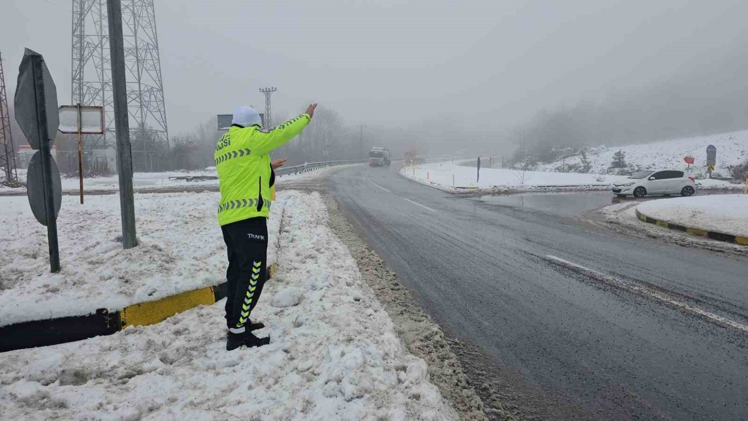 Kandilli beldesi kavşağında da bölge trafik ekipleri çalışmalarını sürdürdü. Çocuklar karın tadını poşetle kayarak çıkardı.