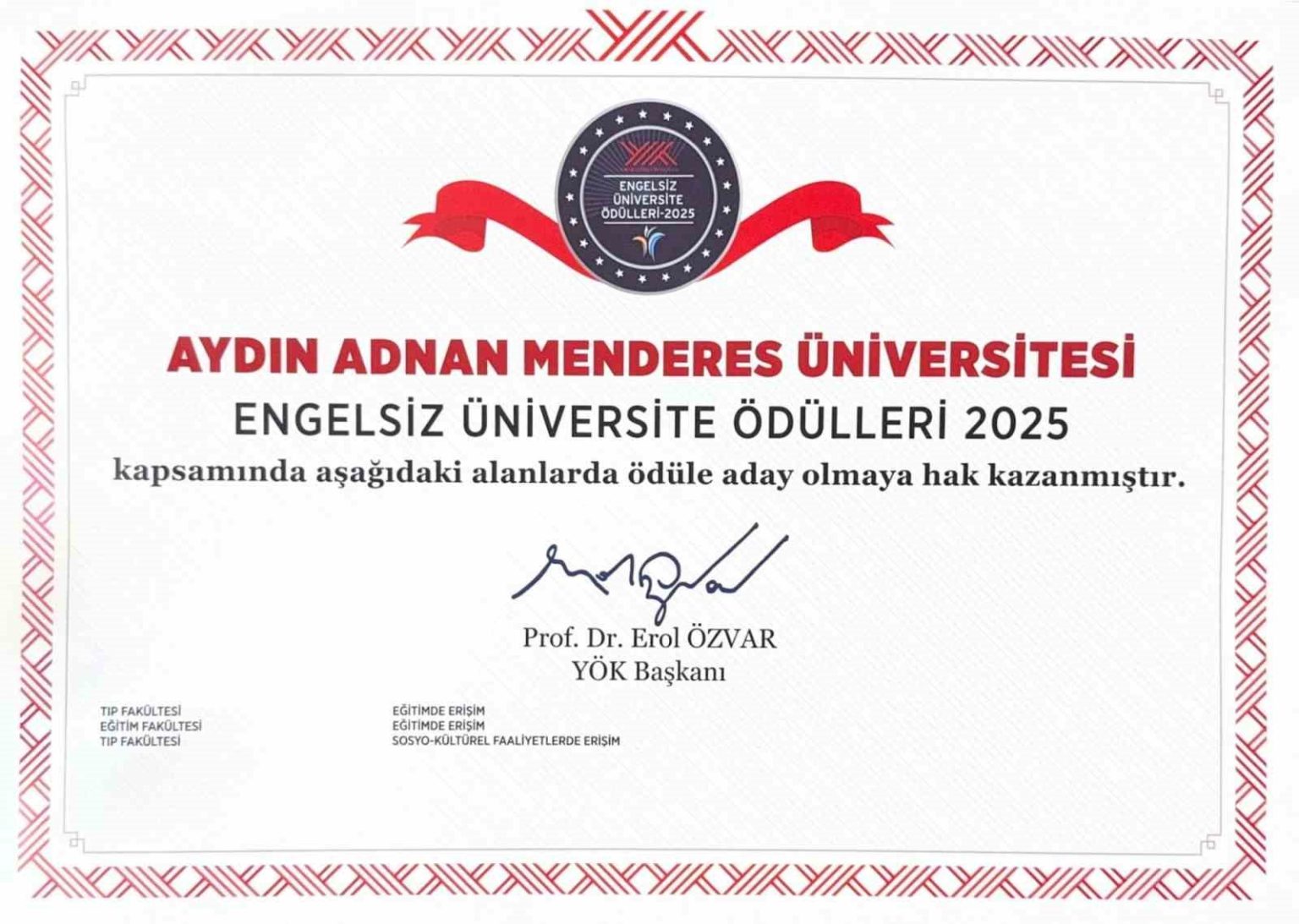 Aydın Adnan Menderes Üniversitesi (ADÜ), yükseköğretimde erişilebilirlik ve kapsayıcılık alanında yürüttüğü çalışmalarla önemli bir başarıya imza attı. Üniversitenin farklı fakülteleri, Yükseköğretim Kurulu (YÖK) koordinasyonunda yürütülen “Engelsiz Üniversite Ödülleri 2025” kapsamında çeşitli kategorilerde ödüle aday gösterildi. ADÜ “Engelsiz Üniversite” vizyonu doğrultusunda hayata geçirdiği uygulamalar ve erişilebilirlik odaklı iyileştirmelerle söz konusu kategorilerde öne çıktı. Tıp Fakültesi, engelli bireylerin eğitim süreçlerine erişimini kolaylaştırmaya yönelik yaptığı düzenlemeler kapsamında “Eğitimde Erişim” kategorisinde “Yeşil Bayrak”, “Sosyo-Kültürel Faaliyetlerde Erişim” kategorisinde ise “Mavi Bayrak” adayı oldu. Eğitim Fakültesi ise gerçekleştirdiği erişilebilirlik çalışmalarıyla “Eğitimde Erişim” kategorisinde “Yeşil Bayrak” adaylığı kazandı.