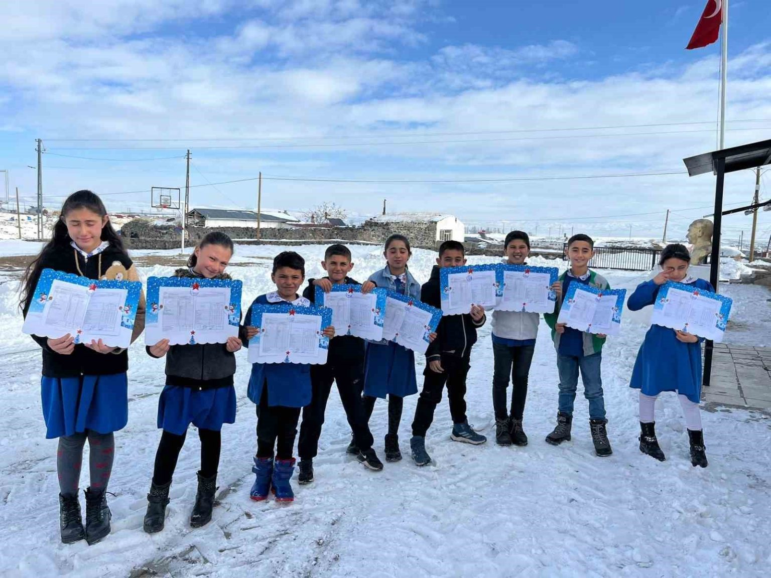 Kars’ın Akyaka ilçesine bağlı Kürekdere İlkokulu’nda yoğun geçen yarıyılın sonunda öğrenciler karnelerini öğretmenlerinin elinden aldı. Onur ve takdirname belgeleriyle karnelerini alan öğrencilerin sevinçleri yüzlerine yansıdı.