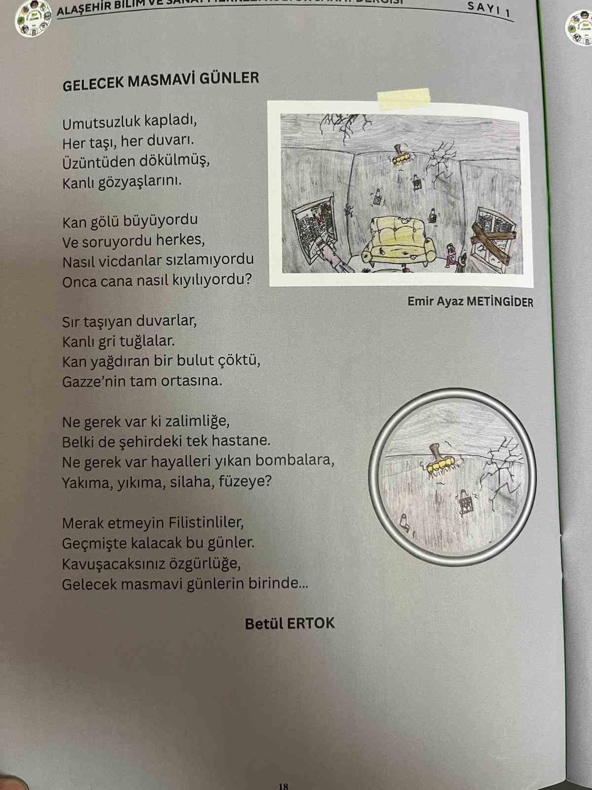 Manisa’nın Alaşehir ilçesinde Bilim ve Sanat Merkezi öğrencileri tarafından hazırlanan Filistin temalı “Düşten Beri” dergisinin tanıtım programında, öğrencilerin kaleme aldığı şiirler okunarak Filistinli çocuklar için güçlü vicdan mesajları verildi.