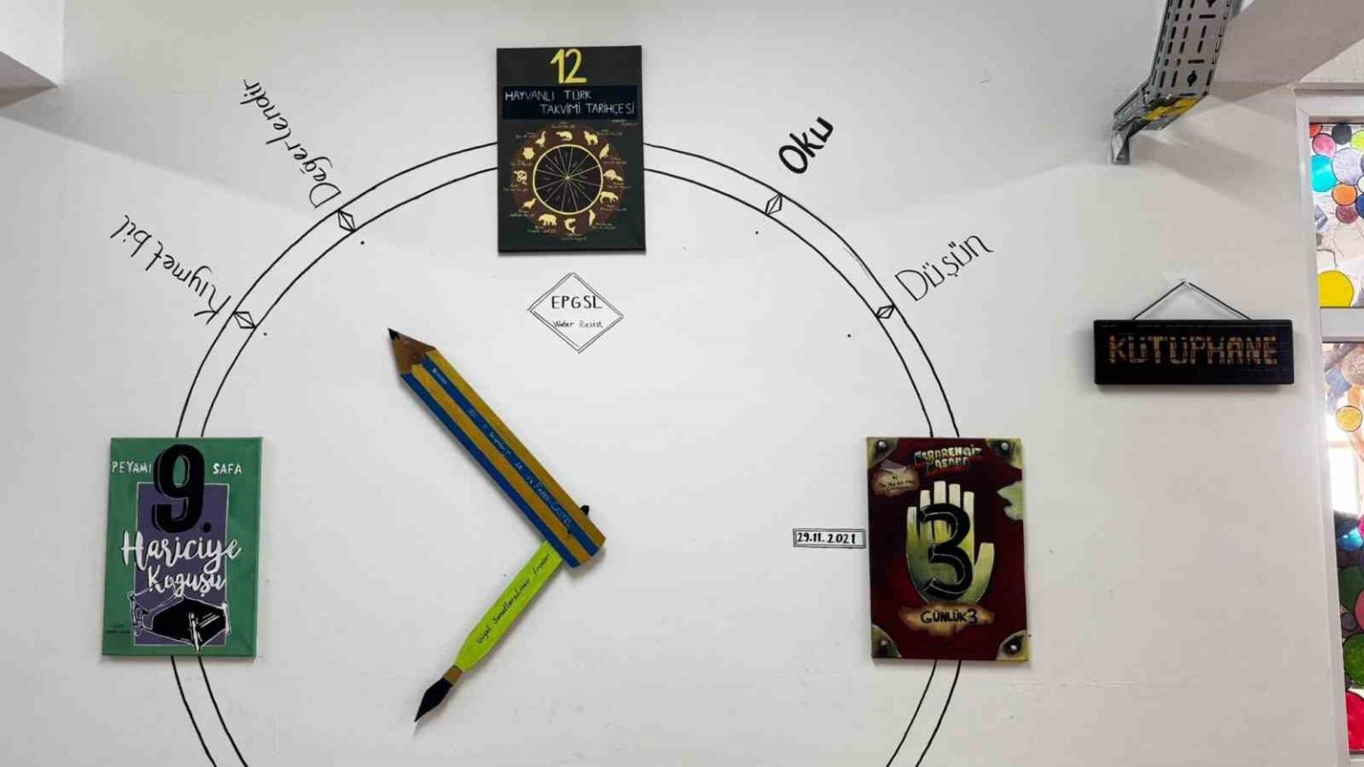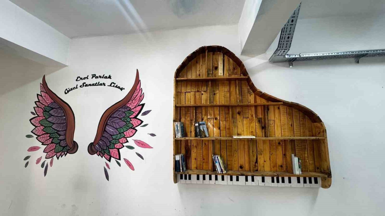 Kaya ayrıca kütüphanede yer alan tüm görsel çalışmaların öğrenciler tarafından yapıldığını belirterek, “Duvarlardaki resimlerden üç boyutlu tasarımlara kadar tüm çalışmalar görsel sanatlar dersleri kapsamında öğrencilerimizin emeğiyle ortaya çıktı. Grafik tasarımdan üç boyutlu sanat eğitimine kadar birçok dersimizi bu kütüphanede işleyebiliyoruz” şeklinde konuştu.