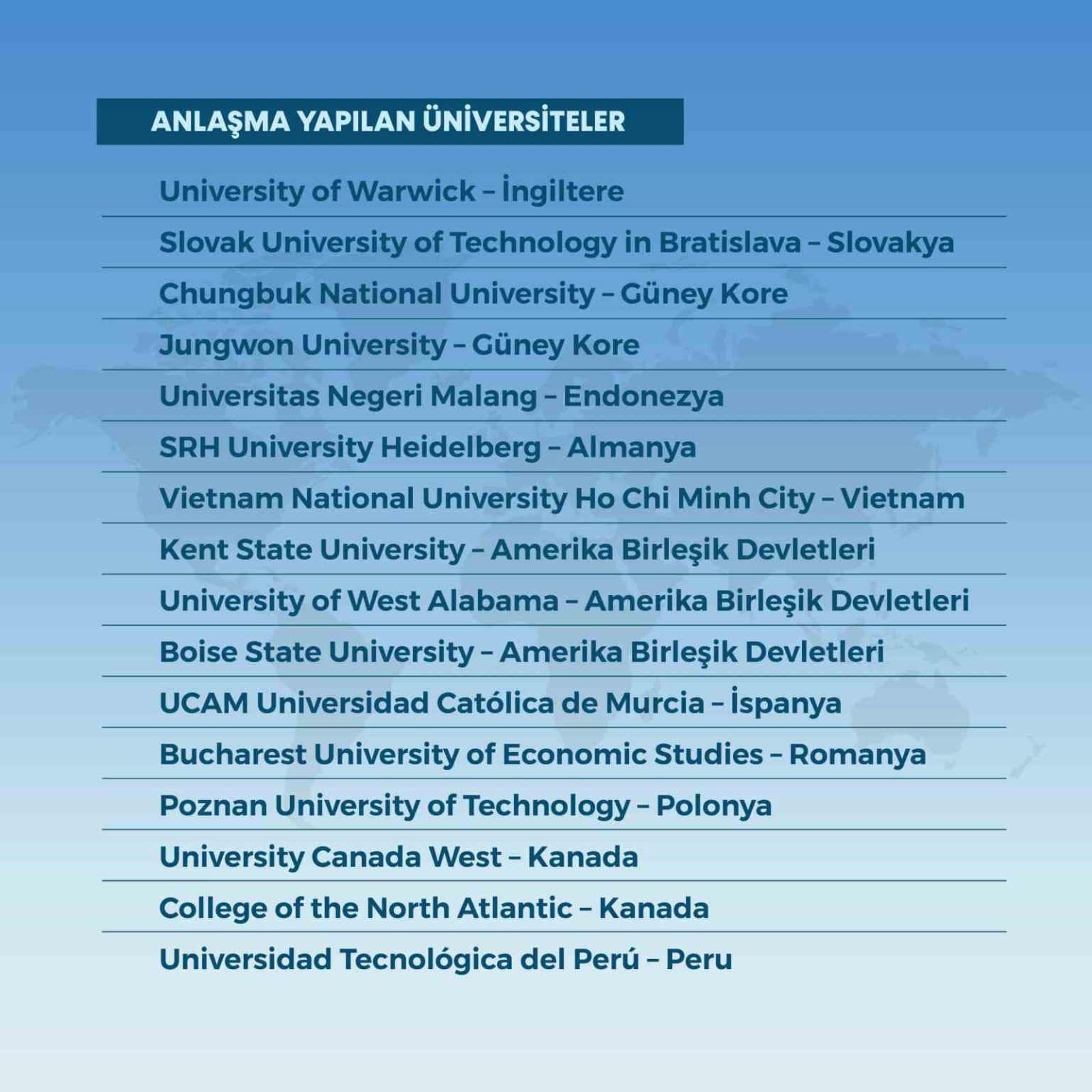 Ayrıca Amerika Birleşik Devletleri’nden Kent State University, University of West Alabama ve Boise State University, İspanya’dan UCAM Universidad Católica de Murcia, Romanya’dan Bucharest University of Economic Studies, Polonya’dan Poznan University of Technology, Kanada’dan University Canada West ile College of the North Atlantic, Peru’dan Universidad Tecnológica del Perú BARÜ’nün yeni iş birliği ağına dahil oldu.