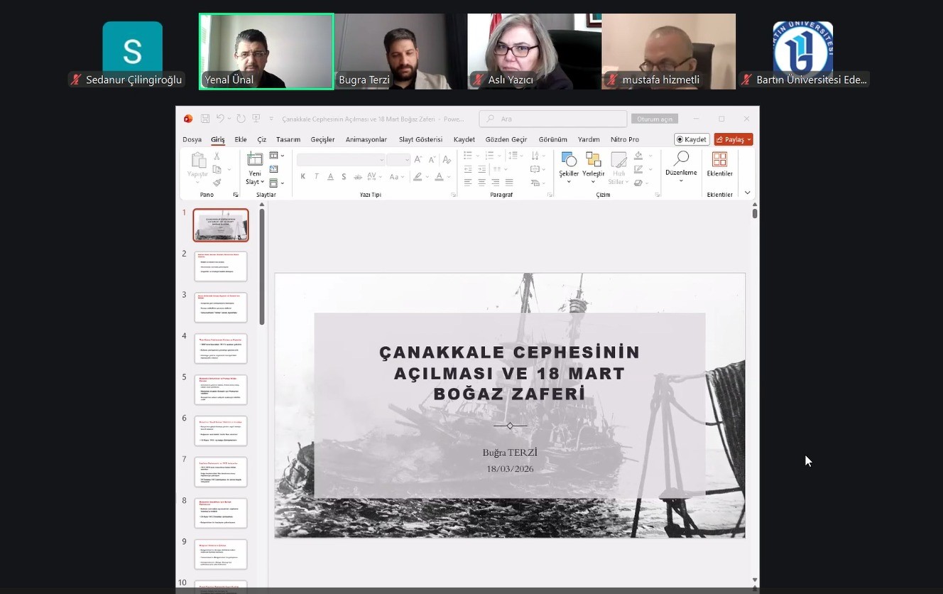 Bartın Üniversitesi (BARÜ) İnsan ve Toplum Bilimleri Fakültesi Tarih Bölümü tarafından 18 Mart Çanakkale Zaferi’nin 111’inci yıl dönümünde bir etkinlik düzenlendi. “Çanakkale Cephesinin Açılması ve 18 Mart Boğaz Zaferi” başlıklı konferansta Çanakkale Savaşları’nın tarihi, arka planı ve sonuçları kapsamlı şekilde değerlendirildi.
