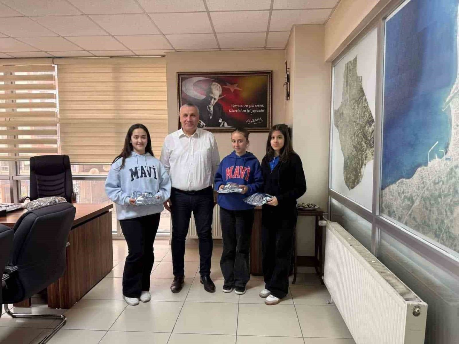 Burhaniye’de, 2204 B Ortaokul Öğrencileri Arası Araştırma Projeleri Yarışması Bölge Finallerine katılan BİLSEM öğrencileri, idareci ve öğretmenleriyle İlçe Milli Eğitim Müdürü Bora Zihni’yi ziyaret etti. Eskişehir Anadolu Üniversitesi Yunus Emre Kampüsü’nde gerçekleştirilen 2204 B Ortaokul Öğrencileri Arası Araştırma Projeleri Yarışması Bölge Finallerinde katılan Burhaniye Bilim ve Sanat Merkezi öğrencileri, Müdür Yardımcısı Ali Ulvi Kara, danışman öğretmenleri Çiğdem Dağcı ve Nadire Persil ile beraber İlçe Milli Eğitim Müdürü Bora Zihni’yi makamında ziyaret etti. Coğrafya kategorisinde ’’Pirina ile tekstilin dönüşümü sürdürülebilir yalıtım’’ isimli projeleri ile 3’üncülük derecesi alan ve finallere katılan öğrenciler, heyecanlarını ve deneyimlerini Müdür Bora Zihni ile paylaştı.