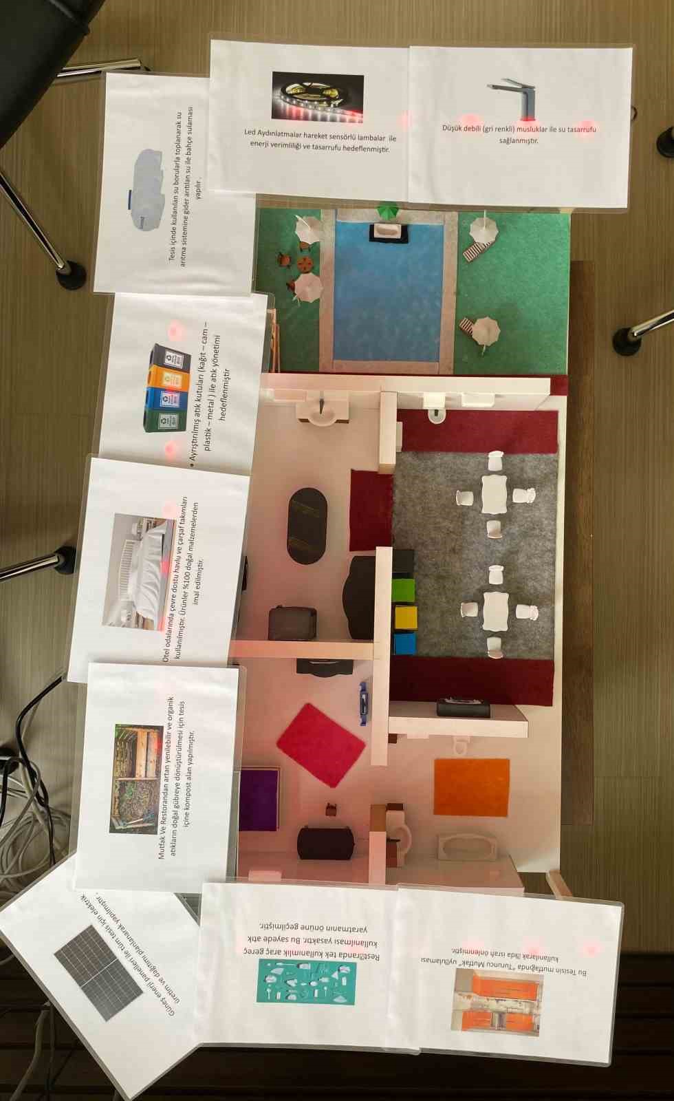 Proje sürecinde, sıfır atık prensiplerine uygun konaklama tesislerinde bulunması gereken uygulamalar, imgeler ve araçlar hakkında kapsamlı bir araştırma gerçekleştirildi. Araştırma sonuçları doğrultusunda ve bilirkişi görüşleri alınarak maketin taslağı oluşturuldu. Hazırlanan makette mutfak, restoran, banyo, otel odası ve bahçe alanları ayrı bölümler halinde tasarlanarak her alanda sıfır atık tesislerinde bulunması gereken uygulamalara yer verildi. Maketin tamamlanmasının ardından düzenlenen lansman etkinliği ile proje tanıtıldı. “Sıfır Atık Sonsuz Gelecek” mottosuyla hayata geçirilen projenin temel amacı; sıfır atık prensiplerine uygun bir otel modeli oluşturmak, geri dönüşüm uygulamalarının turizm sektöründe nasıl kullanılabileceğini göstermek, yeniden kullanım yöntemlerinin önemini vurgulamak ve atık azaltma uygulamalarını tanıtmaktır.