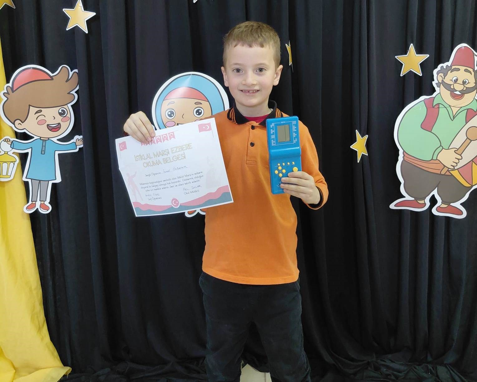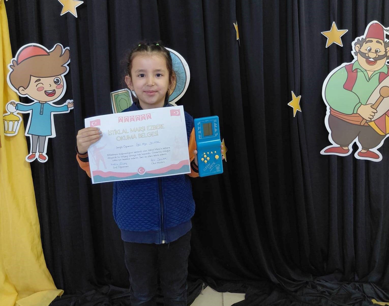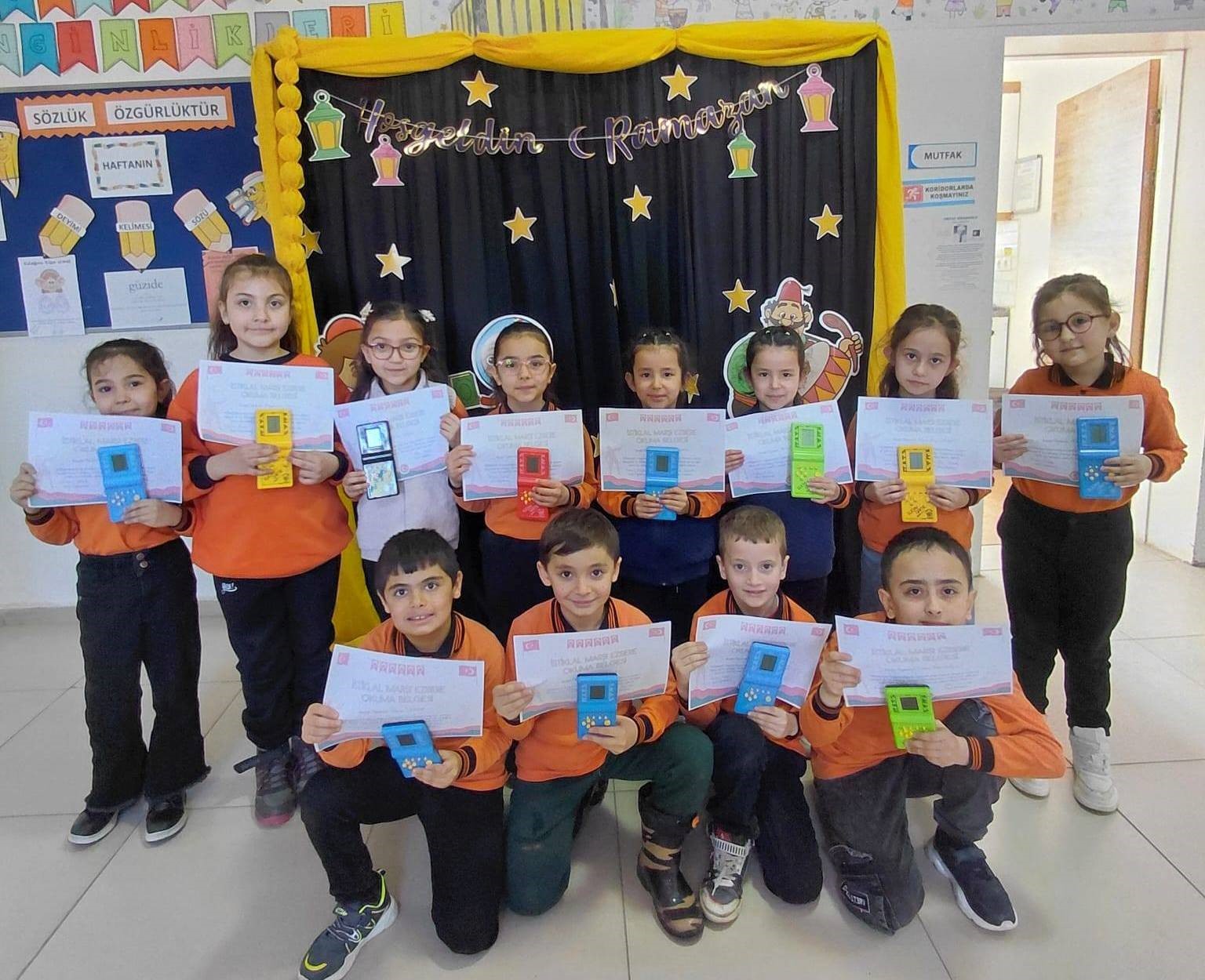 Öğrencilerin bu anlamlı başarısı karşısında Sınıf Öğretmeni İbrahim Güleç, İstiklal Marşı’nı hatasız ve ezbere okuyan 12 öğrenciye “İstiklal Marşı Okuma Belgesi” ile nostaljik el atarisi hediye etti.