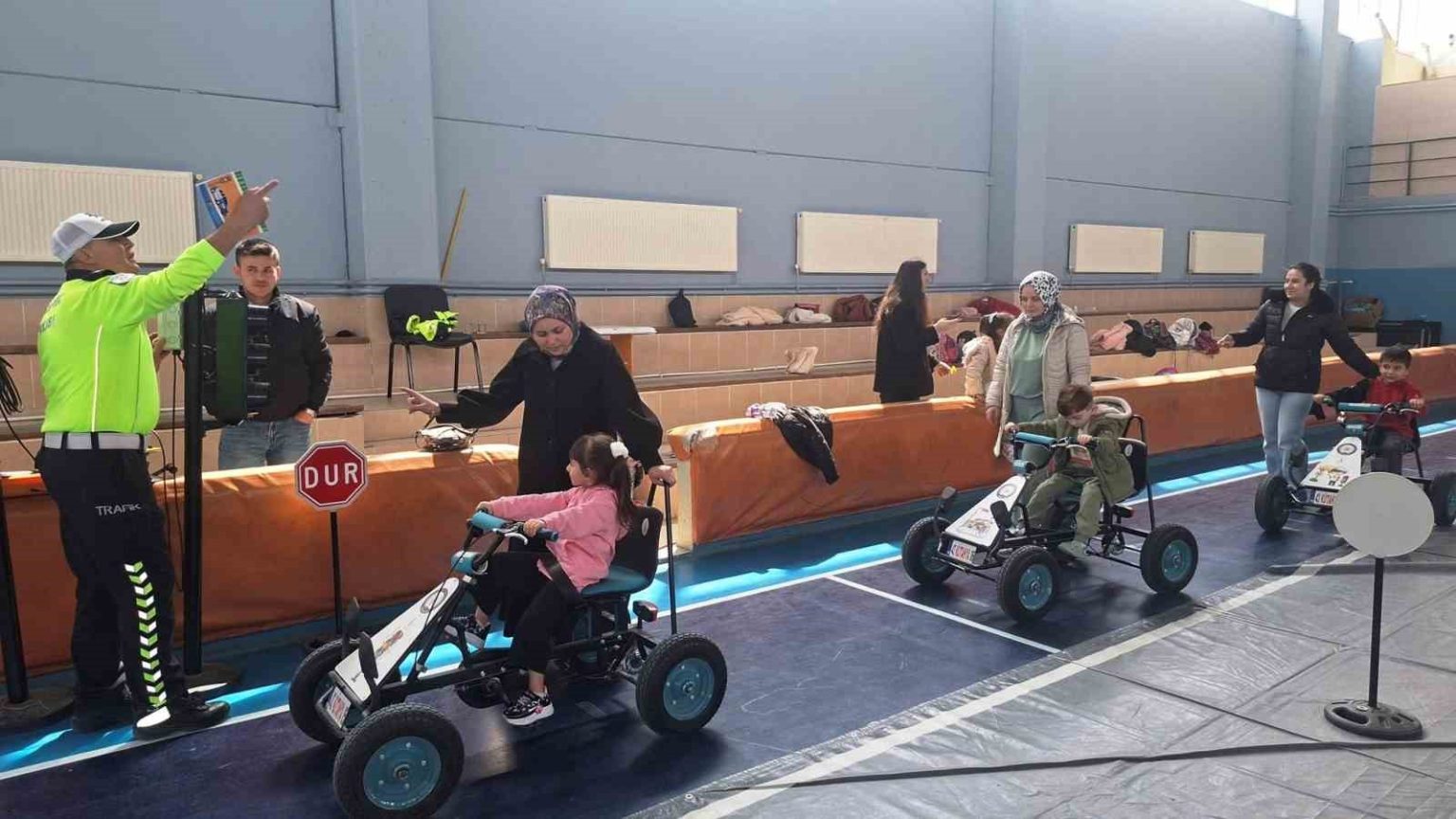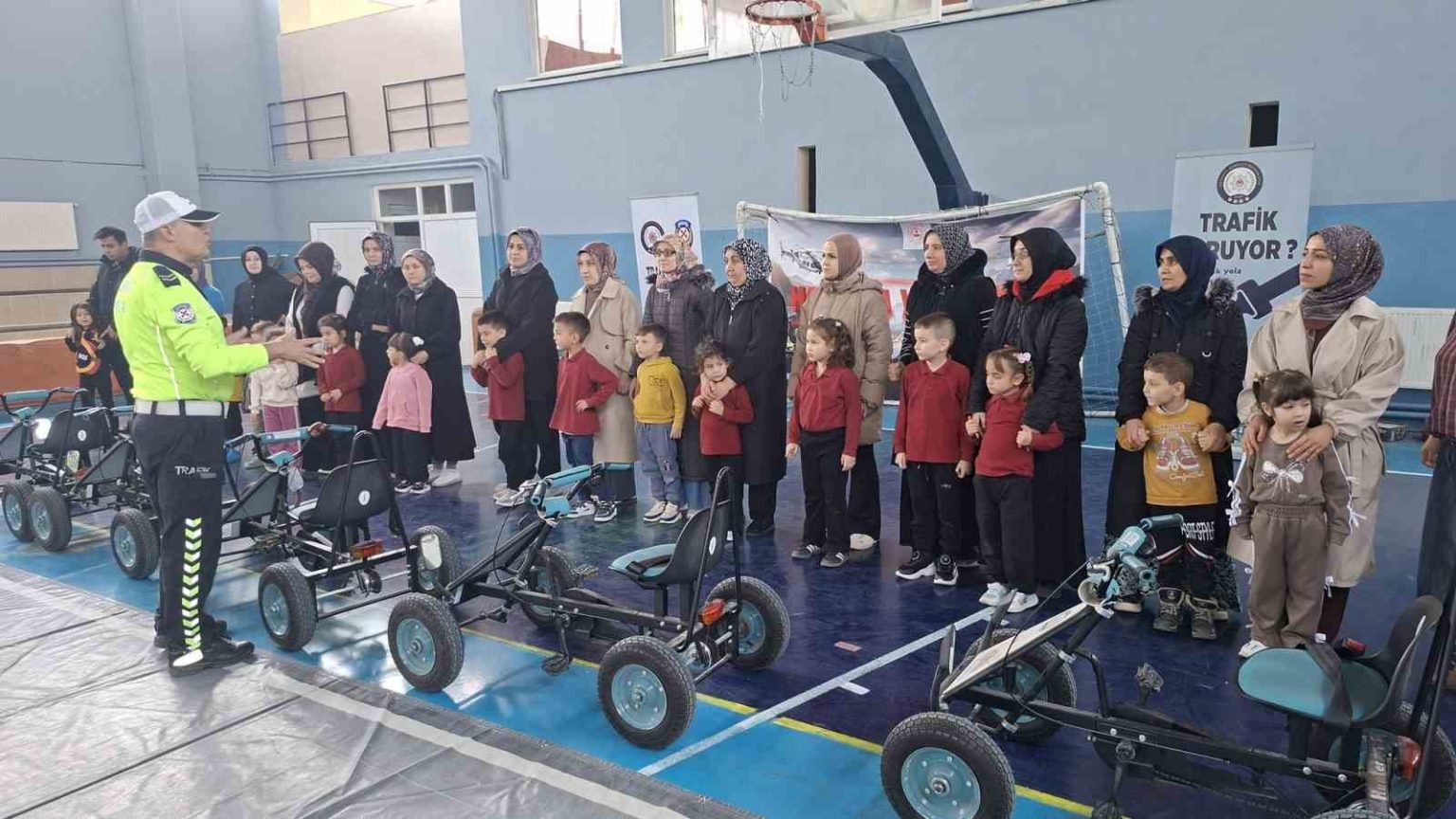 Cumhuriyet İlkokulu Spor Salonu’nda İlçe Emniyet Amirliği ekiplerince kurulan seyyar çocuk trafik eğitim parkında gerçekleştirilen etkinlikte, Kütahya Trafik Denetleme Şube Müdürlüğünde görevli Kıdemli Başpolis Ahmet Kahraman tarafından eğitim verildi. “Bugünün Çocukları Türkiye’nin Yüzyılı” projesi kapsamında düzenlenen eğitim programına Cumhuriyet ve Atatürk İlkokulu ile anaokulu öğrencileri velileriyle birlikte katıldı.