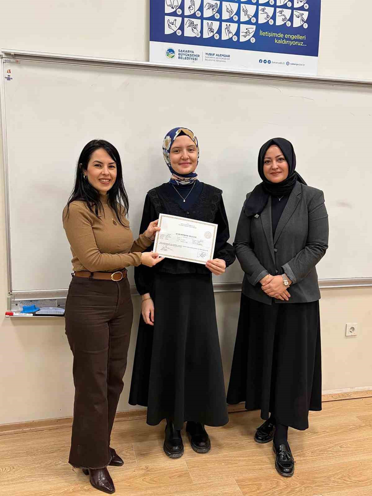 Sakarya’da düzenlenen işaret dili kursuna katılanlar, işitme engelli bireylerle doğru ve etkili iletişim kurmaya yönelik bilgi ve beceriler edinerek sertifikalarını aldı.