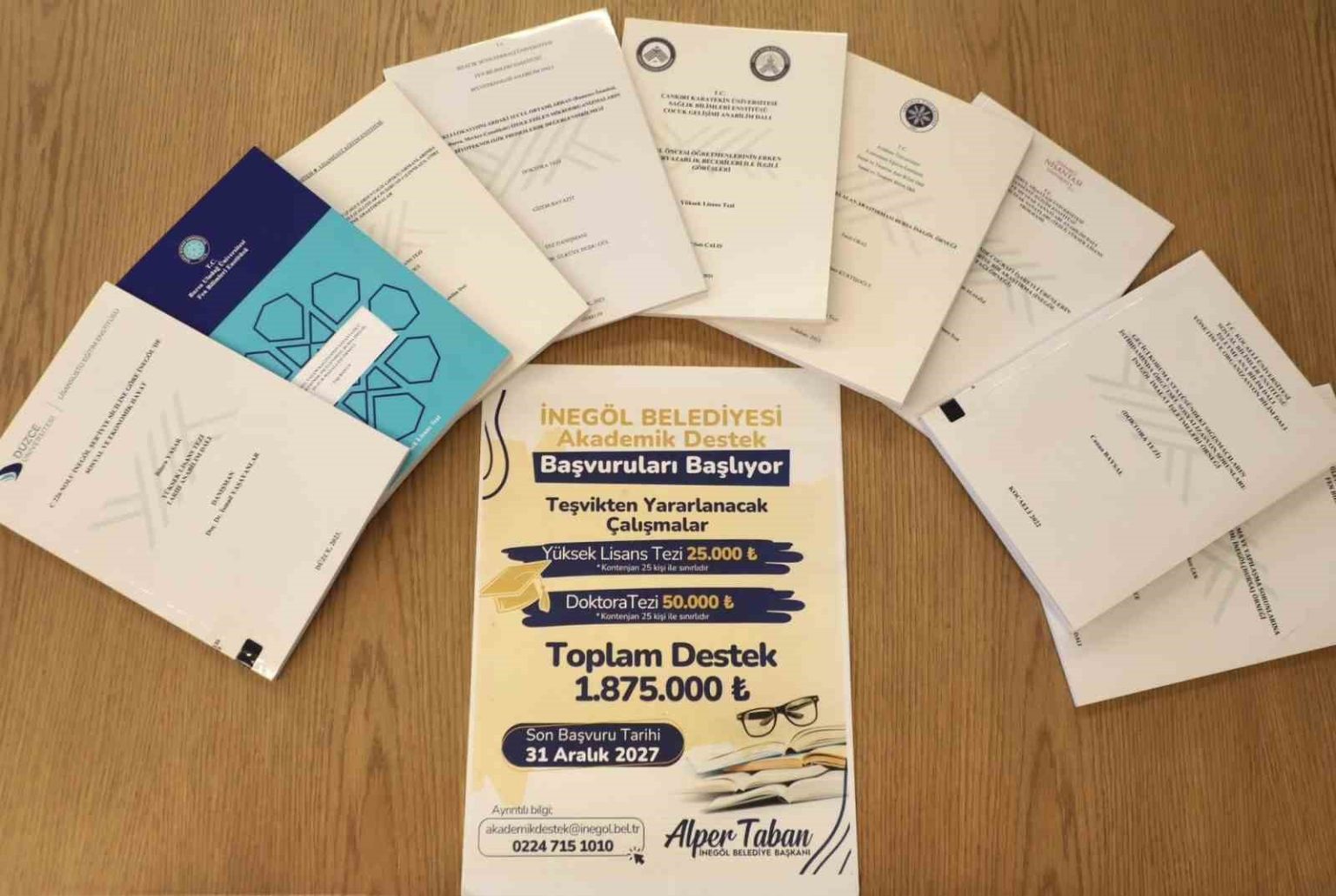 “Akademik Destek Programı kapsamında başvurusu onaylanan kişilere maddi ve maddi olmayan çeşitli destekler sağlanacaktır. Maddi destekler kapsamında; Yüksek lisans tez çalışmaları için 25.000 TL, Doktora tez çalışmaları için 50.000 TL destek verilecektir. Bunun haricinde ilave destekler de var. Konaklama, İnegöl içi ulaşım, rehberlik hizmeti, talep edilen veri ve bilgi paylaşımı gibi imkanlar sağlanacak. Toplamda yaklaşık 2 milyon TL’ye yakın bir destek sağlanmış olacak. Maddi desteklerin %50’si araştırma sürecinde, kalan yüzde 50’si ise çalışmanın tamamlanarak ilgili enstitü tarafından kabul edilmesinin ardından ödenecektir.”