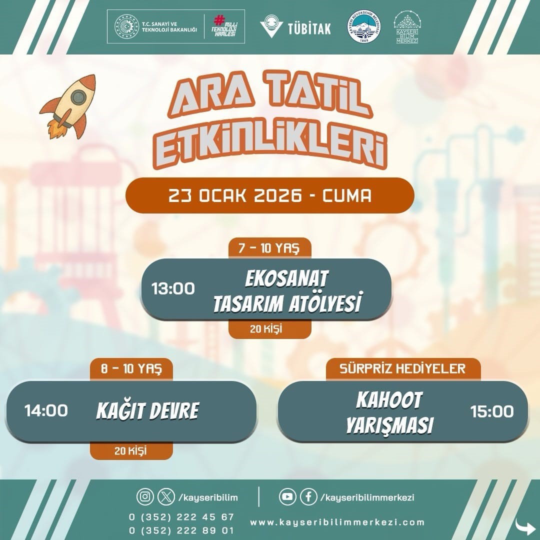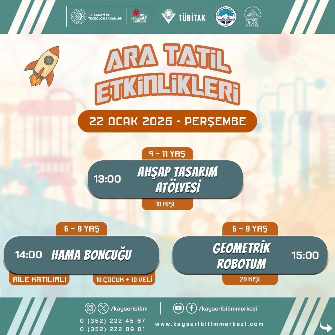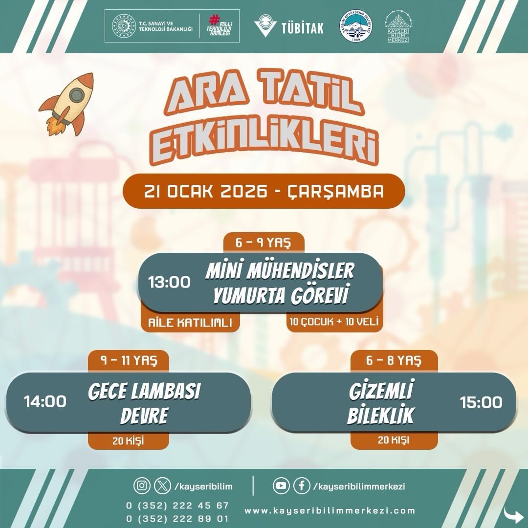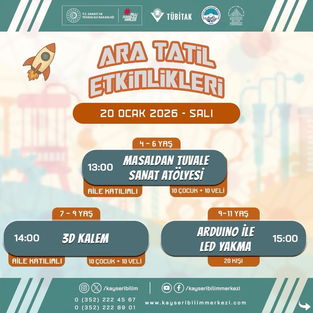Yarıyıl tatilinde bilim, sanat ve teknolojiyi bir araya getirecek ve öğrencilere birbirinden farklı ve ilgi çekici etkinlikler sunacak Kayseri Bilim Merkezi, ziyaretçilerine 20-30 Ocak 2026 tarihleri arasında bu anlamda kapılarını aralayacak. Bilimsel deneylerin, atölyelerin ve teknoloji temelli etkinliklerin yer alacağı programa katılım, kontenjanlarla sınırlı olurken, birbirinden güzel etkinlikler çocukları bekliyor. Toplam 10 gün sürecek olan, 4-12 yaş çocuklar ile aile katılımlı atölyelerin bulunduğu programda, ‘Masaldan Tuvale Sanat Atölyesi, 3D Kalem, Arduino ile LED Yakma, Mini Mühendisler Yumurta Görevi, Gece Lambası Devre, Gizemli Bileklik, Ahşap Tasarım Atölyesi, Hama Boncuğu, Geometrik Robotum, Ekosanat Tasarım Atölyesi, Kağıt Devre ve Kahoot Yarışması gibi birbirinden ilgi çekici ve geliştirici faaliyetler, katılımcılarla olacak.