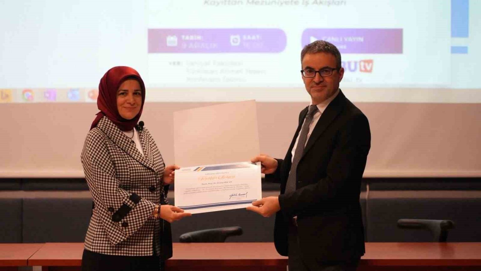 Etkinliğin sonunda, Prof. Dr. Zeynep Özcan’a katkılarından dolayı İktisadi ve İdari Bilimler Fakültesi Dekanı Prof. Dr. Ersin Müezzinoğlu tarafından teşekkür belgesi verildi.