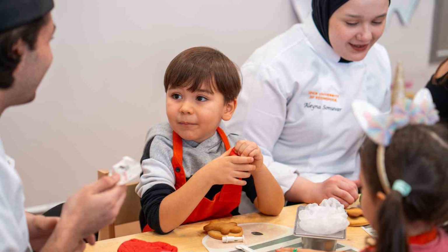 Yılbaşı temasına özel olarak kar tanesi, baston şemsiye, kardan adam ve yılbaşı şapkası gibi farklı şekillerde kurabiyeler yapan çocuklar, gönüllerince bir gün geçirdi. Pastacılık dersi eğitmen şefi Ece Eryener’in rehberliğinde, Gastronomi ve Mutfak Sanatları Bölümü öğrencileriyle çalışarak renkli şeker hamurlarına şekil veren, birbirlerinin kurabiyelerini süsleyen ve merak ettiklerini soran çocuklar, eğlenirken öğrenme fırsatı buldu.