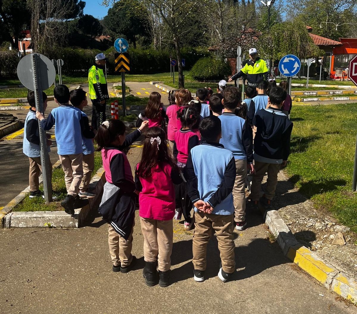 Geleceğin bilinçli yaya ve sürücüleri olarak yetiştirilmeleri hedeflenen etkinlikte, öğrenciler hem eğlendi hem de trafik kurallarını uygulamalı olarak öğrendi. Polis memurları Uğur Yağcı ve Engin Erdem, eğitim sırasında öğrencilere yaya ve okul geçitlerinde güvenli hareket etme kurallarını, okul servislerinde doğru yolculuk davranışlarını ve temel trafik güvenliği bilgilerini detaylı şekilde anlattı.