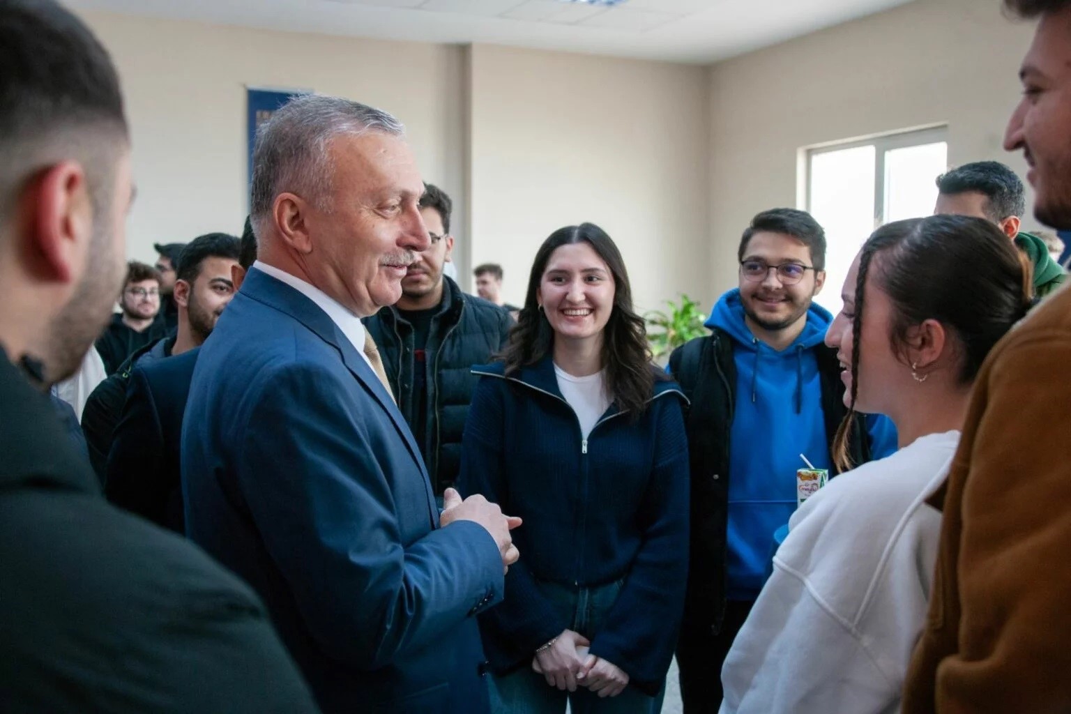 Öğrencilerle sohbet eden Rektör Levent, öğrencilerin talep ve beklentilerini dinleyerek mezuniyet sonrası iş olanakları ve kariyer planlaması hakkında değerlendirmelerde bulundu. Programın sonunda Prof. Dr. Akın Levent, yaklaşan final sınavları öncesinde öğrencilere başarı dileklerini iletti.
