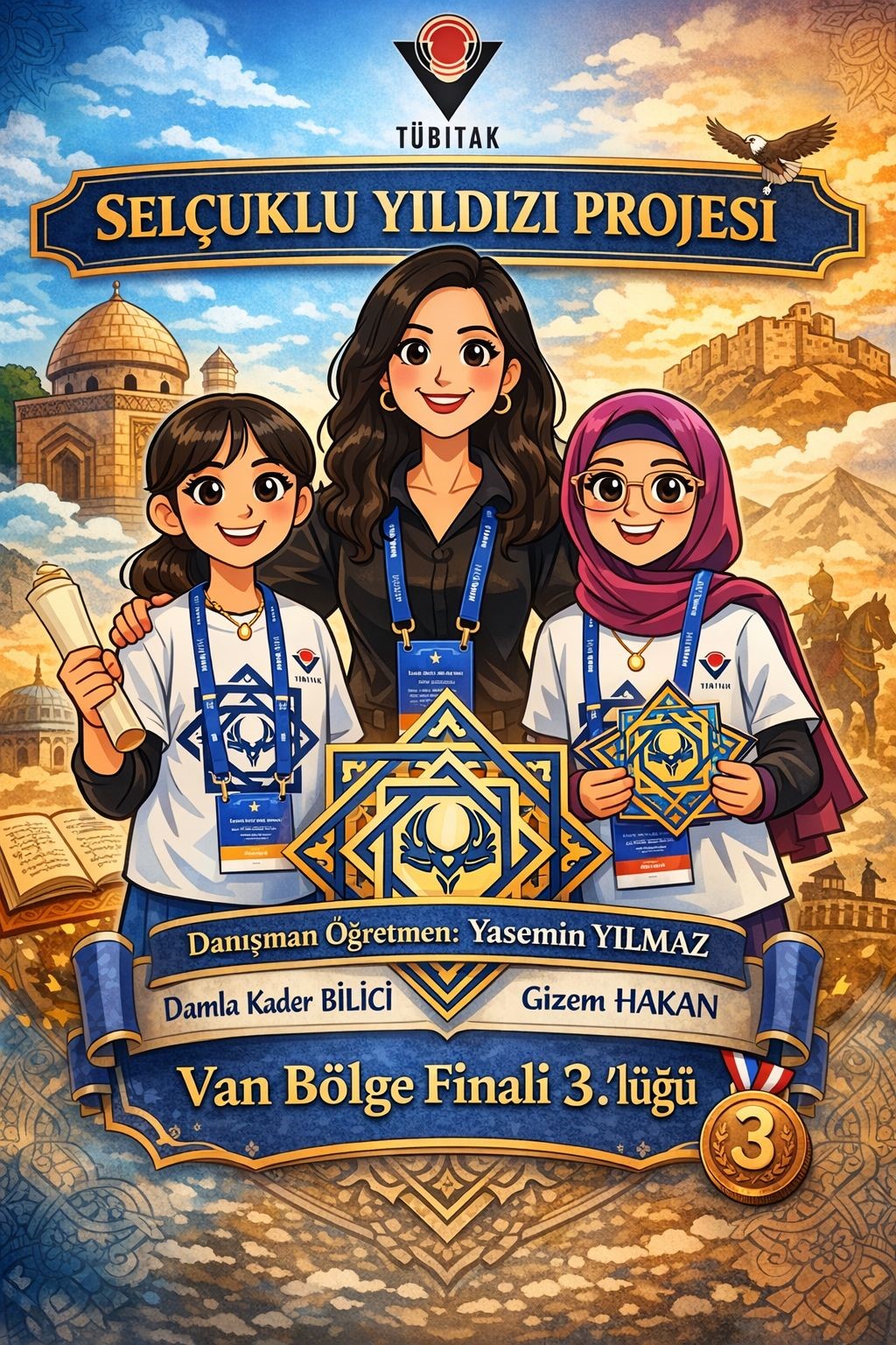 Yavuz Selim Ortaokulu öğrencileri Kader Damla Bilici ve Gizem Hakan, tarih alanında “Değerler Eğitimi” temasıyla hazırladıkları “Selçuklu Yıldızı” projesi ile Van bölge finalinde üçüncülük elde ederek ilçenin gururu oldular. Uzun süren çalışmalar sonucunda ortaya çıkan proje; öğrencilerin bilimsel düşünme, araştırma, analiz ve yorumlama becerilerini geliştirirken, geçmişten günümüze kültürel değerlerin aktarılmasına da katkı sundu.