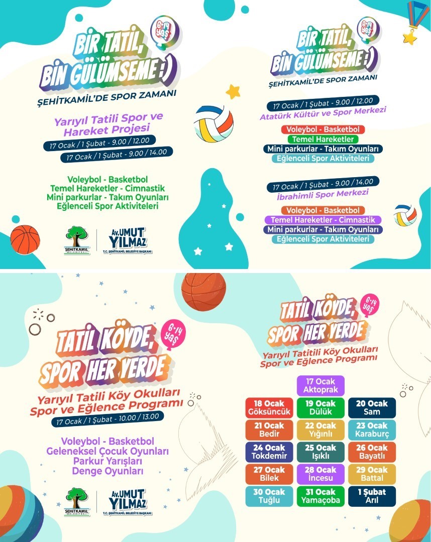 “Bir Tatil Bin Gülümseme” projesi ile de Atatürk Kültür ve Spor Merkezi ile İbrahimli Spor Merkezi’nde de 17 Ocak Cumartesi ile 01 Şubat Pazar tarihleri arasında her gün 09.00-14.00 saatleri arasında çeşitli spor ve eğlence etkinlikleri gerçekleştirilecek. Merkezlerde düzenlenecek programlarla kent merkezindeki çocuklar da yarıyıl tatilini aktif ve verimli şekilde değerlendirecek.