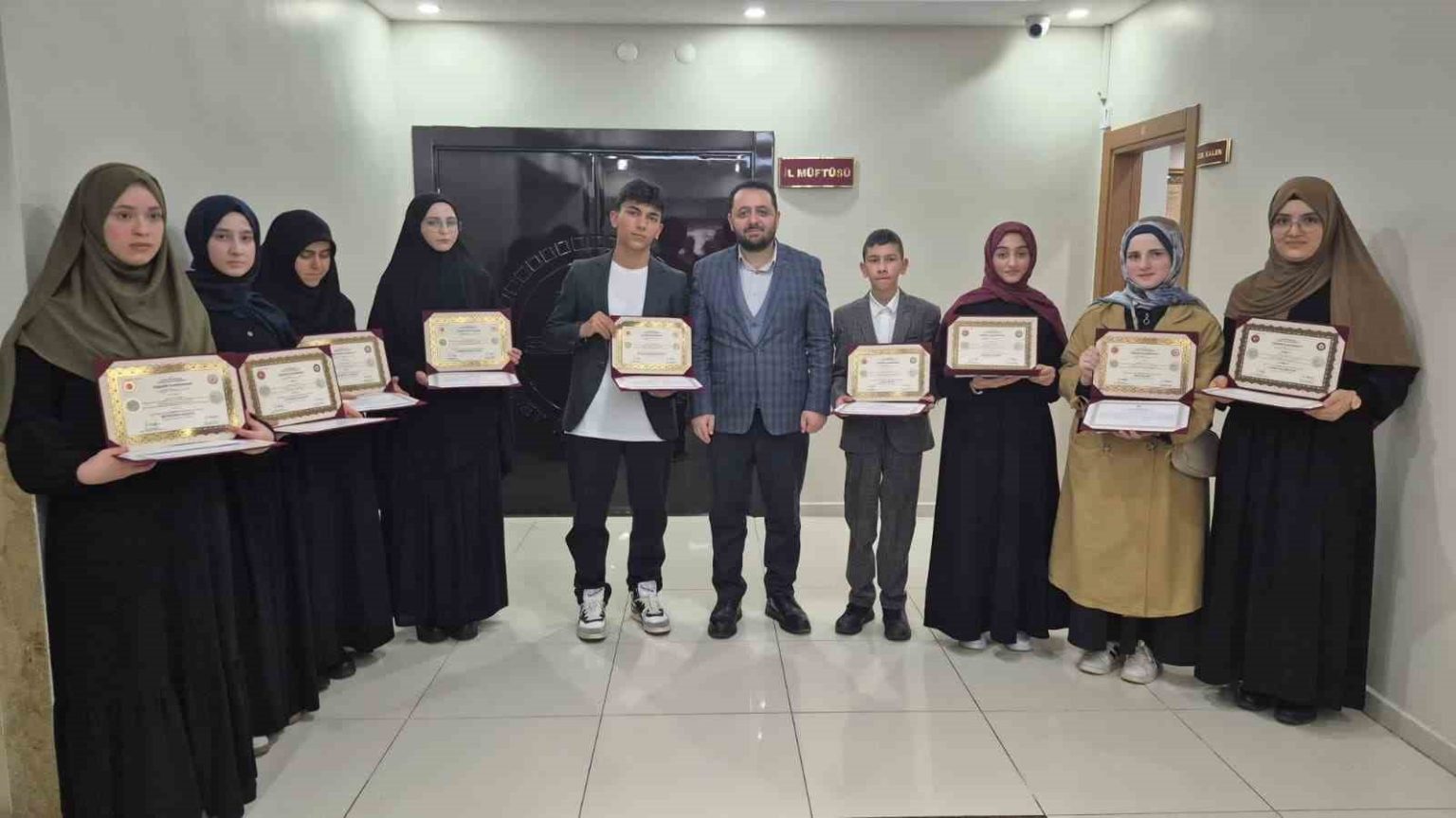 Diyanet İşleri Başkanlığı tarafından gerçekleştirilen 2026 Yılı 1. Dönem Hafızlık Tespit Sınavı’nda başarılı olan 2’si erkek, 8’i kız olmak üzere toplam 10 öğrenci, düzenlenen törenle belgelerini aldı.