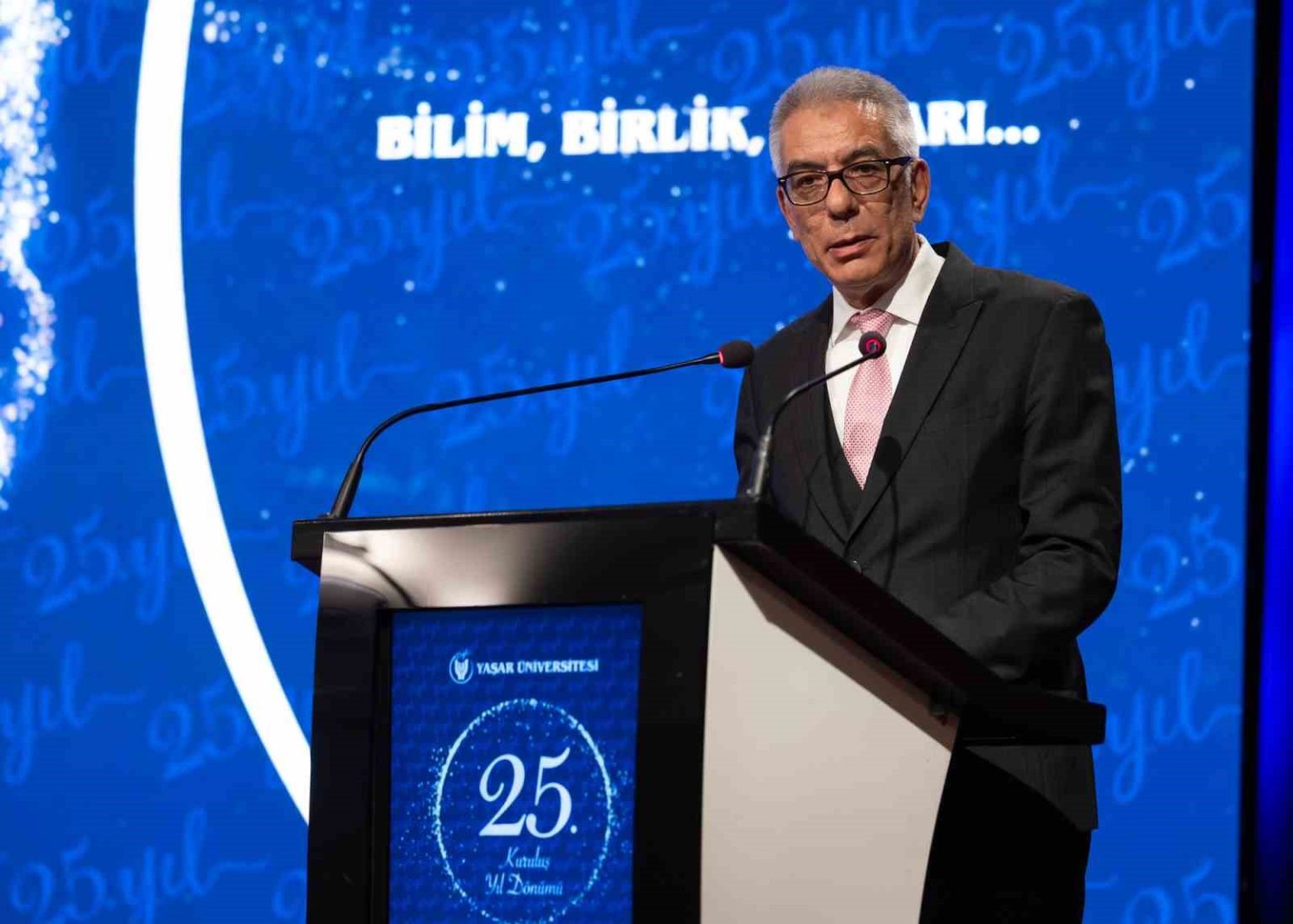 Yaşar Üniversitesi Mütevelli Heyet Başkanı Ahmet Yiğitbaşı ise şöyle konuştu: “2001 yılında, 52 öğrenciyle yola çıktığımızda; Kurucumuz ve Ebedi Onursal Başkanımız Selçuk Yaşar’ın zihninde tek bir hedef vardı: Vatanına ve milletine faydalı, bilimle donatılmış çağdaş nesiller yetiştirmek. O gün dikilen fidan, bugün dalları dünyaya uzanan dev bir çınara dönüştü. Bugün ne mutlu bize ki; 8 bin 400 öğrencimiz, 21 bin 500 başarılı mezunumuz, 880 akademik ve idari personelimiz ve dünya çapındaki başarılarımızla örnek gösterilen bir kurum olmanın gururunu yaşıyoruz. Bugün kampüsümüzde 49 farklı ülkeden gelen 412 uluslararası öğrencimizi ağırlıyor; tam 12 projemizle Erasmus Plus Jean Monnet programında Türkiye birinciliğimizi koruyoruz. Yaşar Üniversitesi Teknoloji şirketi YUTECH ve BTTO ofisimiz bünyesinde, toplam bütçesi 33 milyon TL’yi aşan 191 farklı kamu-üniversite-sanayi iş birliği projesini başarıyla hayata geçirdik. Sadece geçen yıl 14 ulusal ve uluslararası patent başvurusu yaptık, sürdürülebilirlikten dijitalleşmeye, tarım-gıda zincirinden yenilenebilir enerjiye kadar geniş bir yelpazede 22 uluslararası projeyi de başarıyla yürütüyoruz. 150 projeyi başarıyla tamamlamış olmamız ve sadece bir yıl içerisinde hazırladığımız 60 yeni proje başvurusu, araştırma kapasitemizi küresel standartlara taşıma azmimizin bir yansımasıdır. Toplam bütçesi 4 milyon Euro olan 11 projemiz hibe desteği alırken, 26 projenin de aktif ortağı olarak Avrupa araştırma ağının vazgeçilmez bir parçası olmayı sürdürüyoruz.”