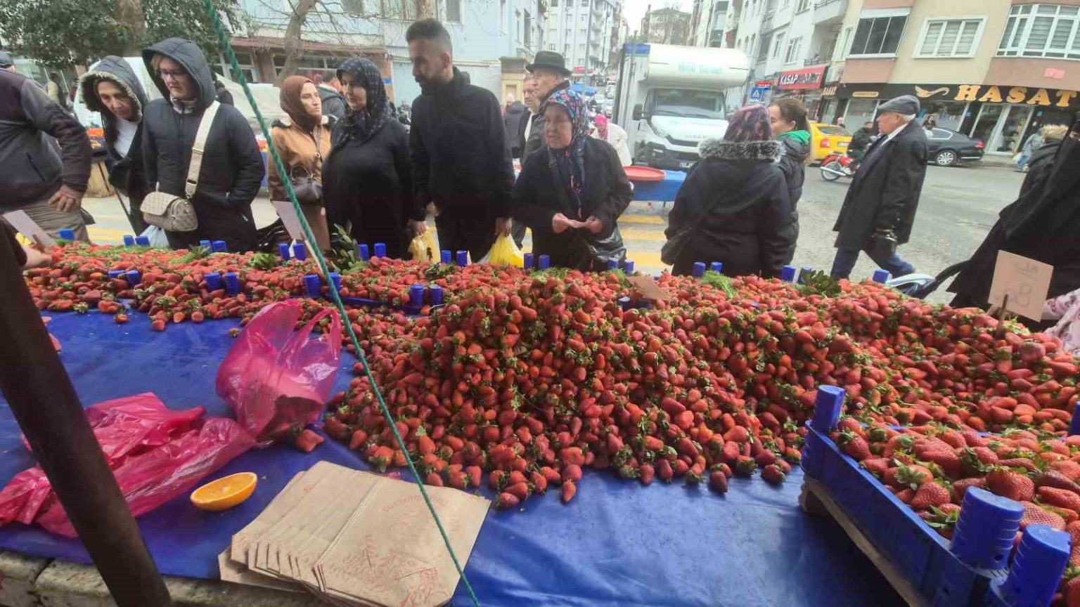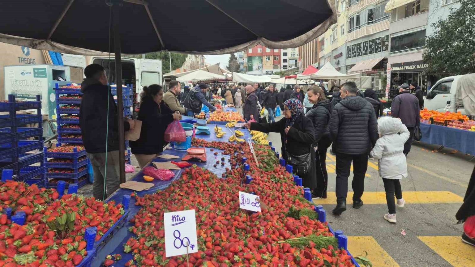 Tekirdağ’ın Süleymanpaşa ilçesinde haftanın en yoğun günlerinden biri olan Salı Pazarında tezgahlar hareketlendi. Bursa etiketiyle satışa sunulan çileklerin kilosunun 80 TL olması dikkat çekerken, vatandaşların tezgaha akın ettiği görüldü. Sabahın erken saatlerinden itibaren kurulan pazarda çilek tezgahlarının önünde zaman zaman yoğunluk oluştu.