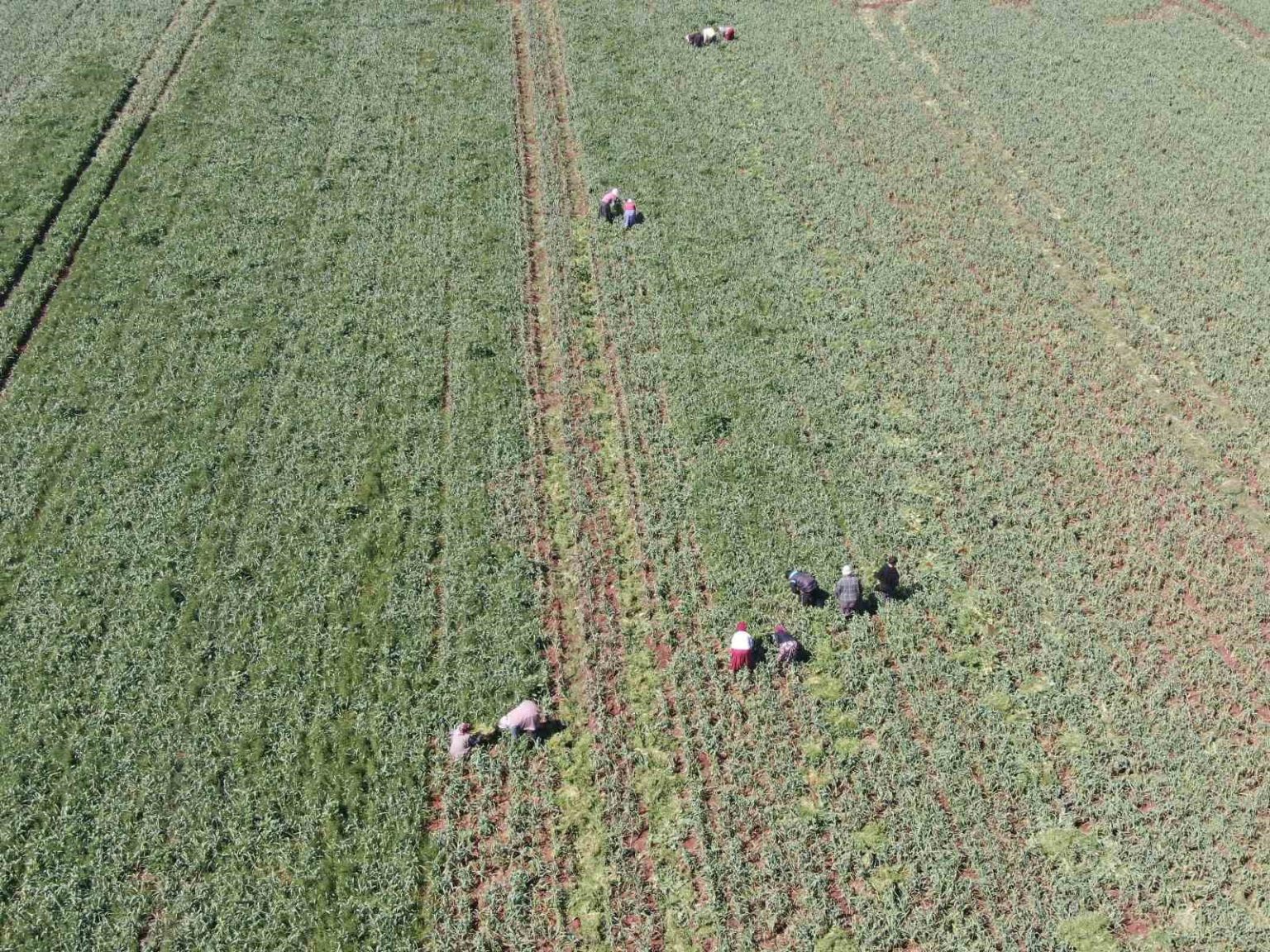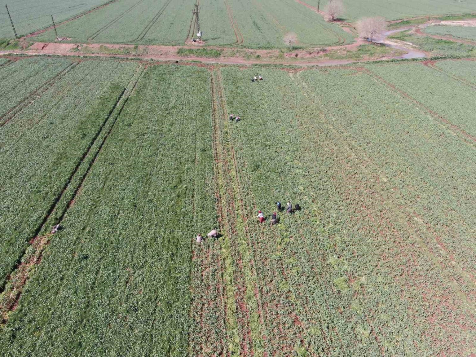 30 bin dönüm arazi üzerine ekili sarımsak bulunduğunu ve rekoltenin beklenenin üstünde olacağını söyleyen Altun, “Hasadımız yaklaştı. 1 ay sonra yeşil sarımsak hasadı yapacağız. Mayısın 15’inde de normal sofralık sarımsak hasadına başlayacağız. Dolayısıyla hem sevinçliyiz hem de mutluyuz. Bu sene hasadın bol olmasını bekliyoruz ve her yere sarımsak göndereceğiz. Bu sene 30 bin dönüm arazi üzerine ekili sarımsağımız var. Rekoltemiz yüksek olacak” dedi.