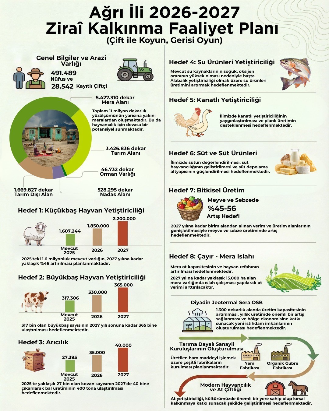 Tarım ve Orman Bakanlığı’nın 2024-2028 Stratejik Planı ile Ulusal Kırsal Kalkınma Stratejisi-IV doğrultusunda hazırlanan “Ağrı İli Zirai Kalkınma Faaliyet Planı” yürürlüğe girdi. Plan, Valilik himayesinde ve koordinasyonunda Tarım ve Orman İl Müdürlüğü başta olmak üzere kamu kurum ve kuruluşları, meslek odaları, birlikler, kooperatifler ve sivil toplum kuruluşlarının katkısıyla hazırlandı. Faaliyet planında ilin tarımsal envanteri, üretim desenleri ve kırsal sosyo-ekonomik yapısı dikkate alındı. Bitkisel üretim, hayvancılık, su ve toprak kaynaklarının korunması, mera yönetimi, tarımsal altyapı yatırımları, çiftçi eğitimleri ile destekleme ve hibe mekanizmaları planın ana başlıkları arasında yer aldı.