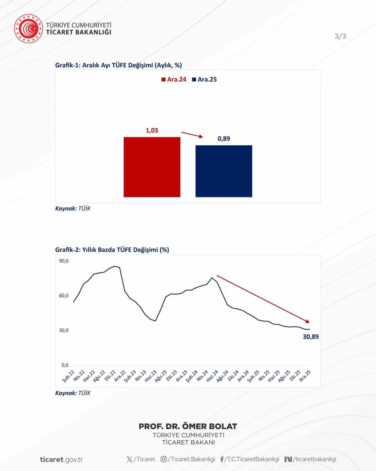 Bolat, Aralık ayında enflasyonda önemli bir düşüş görüldüğünü belirterek “2025 yılı Aralık ayında aylık enflasyon yüzde 0,89 olarak gerçekleşti. Böylece yıllık enflasyon Aralık ayında yüzde 30,89’a geriledi” dedi.