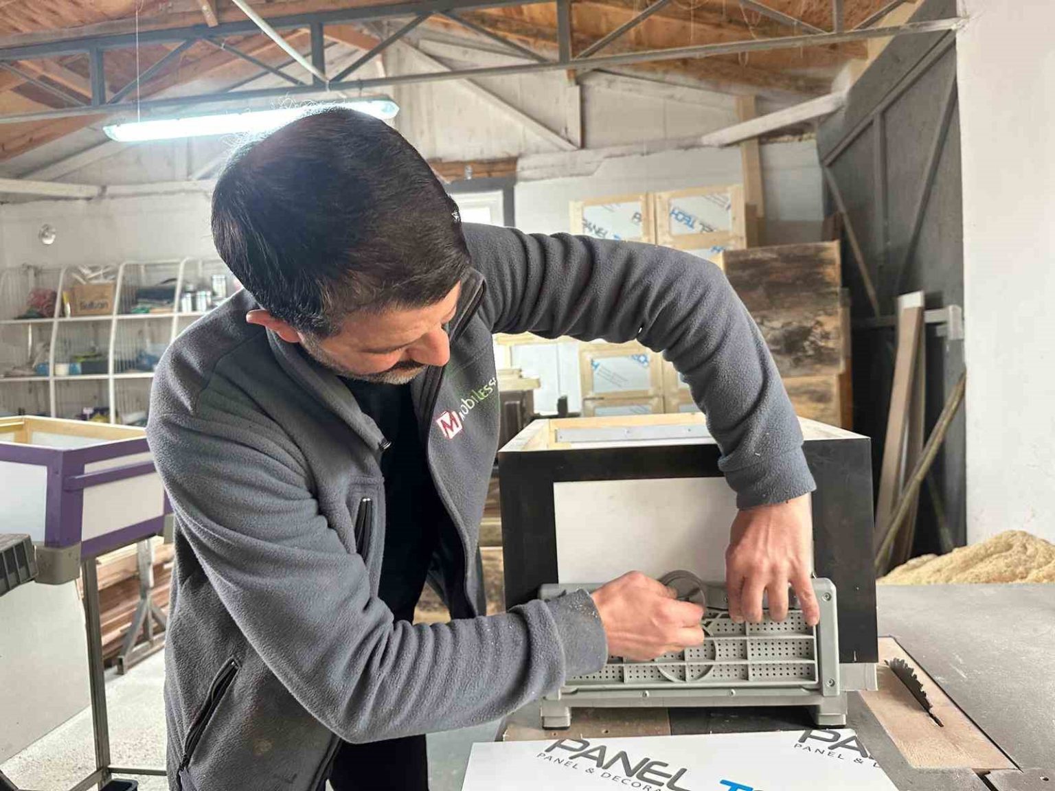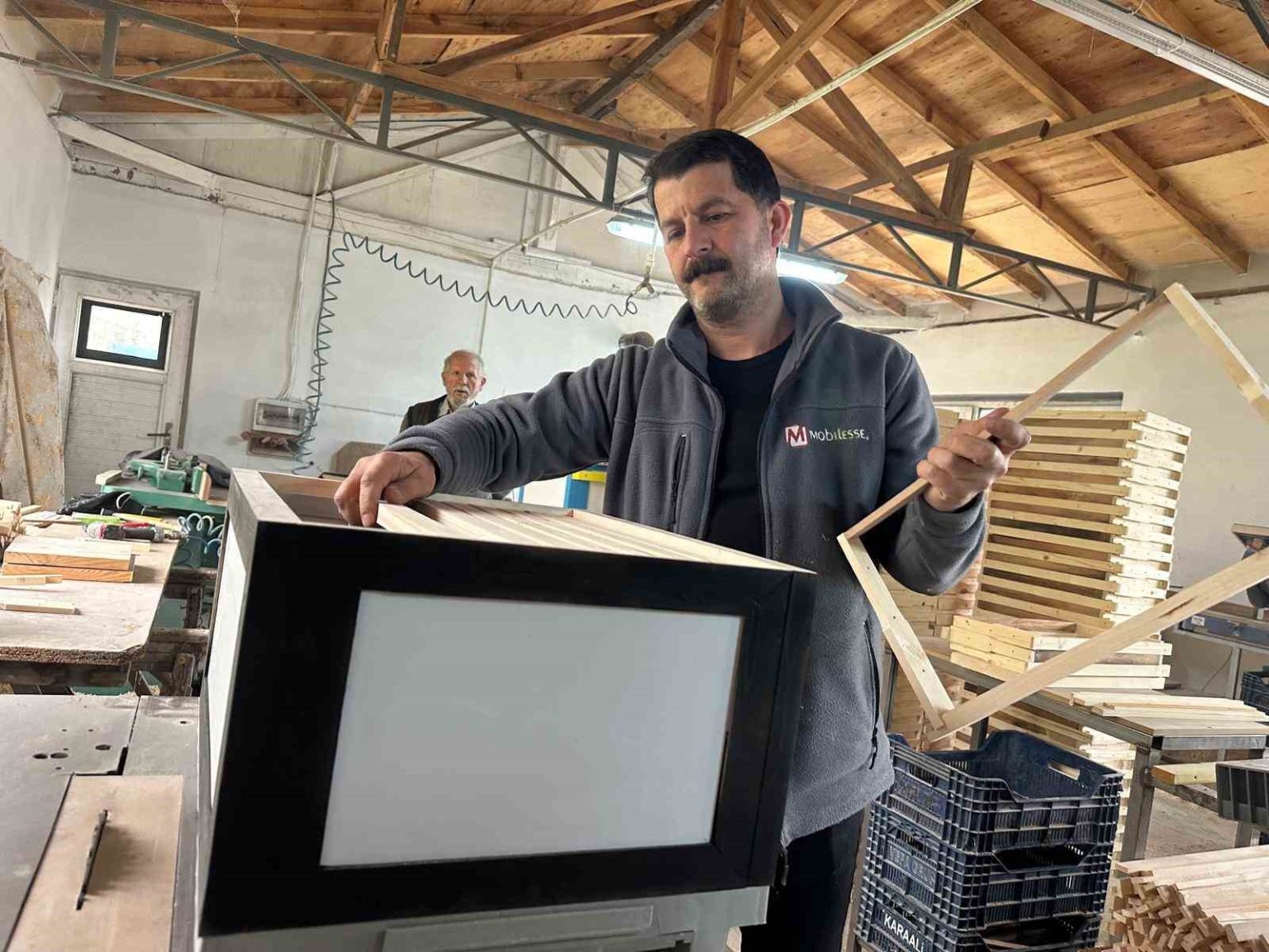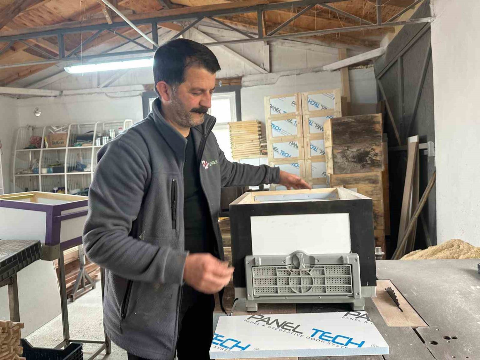 “Sandviç panelli kovanlarımız ısı yatılımı sağlıyor. Polen tuzaklı kovan bunlar. Bu kovanlarda rutubet ve nem terleme oranı çok daha düşük. Sandviç paneller çevre dostu bir malzemeden yapılıyor. Diğer kovanlar genellikle çam ağacından yapıldığı için ağır oluyorlar. Biz ithal Sibirya ladini kullanıyoruz. Bunlar daha hafif oluyor. Çerçevede bile bu ladinlerden kullanıyoruz.”