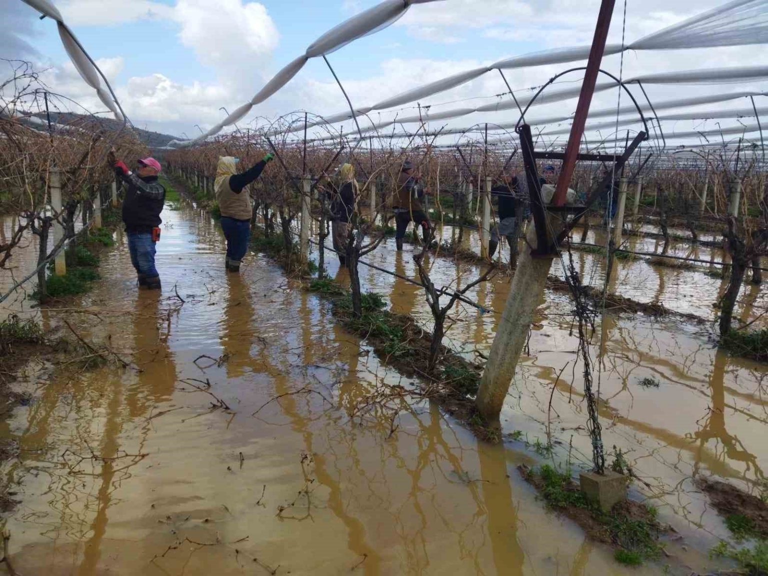 İşçilerin göle dönen bağlarda çalıştığını gören tanıdıkları ise espri yaparak, “Balık var mı?” diye takılıyor. Yaklaşık 15 kişilik ekip, suyla kaplanan bağlarda tüm zorluklara rağmen budama çalışmalarını sürdürüyor.