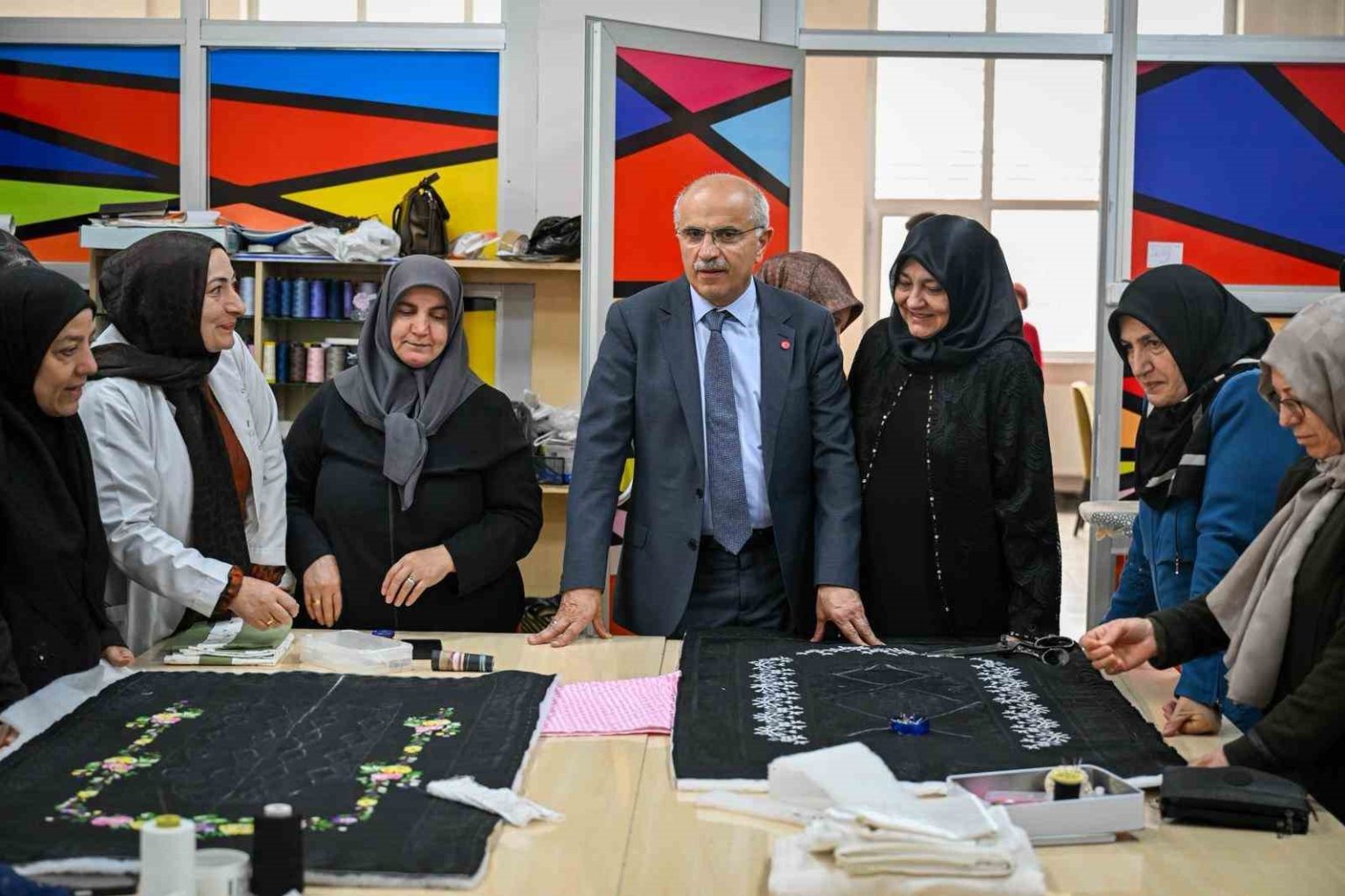 Kadınlara yönelik faaliyet gösteren giyim, mefruşat, el sanatları, saç bakım ve tasarım, biçki dikiş kurslarını ziyaret ederek, kursiyerlerle bir araya gelen Başkan Er, Büyükşehir Belediyesi olarak yaptıkları hizmetlerden insanların hoşlanmasının, fayda görmesinin kendilerini mutlu ettiğini belirtti.