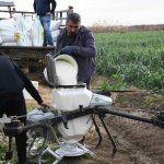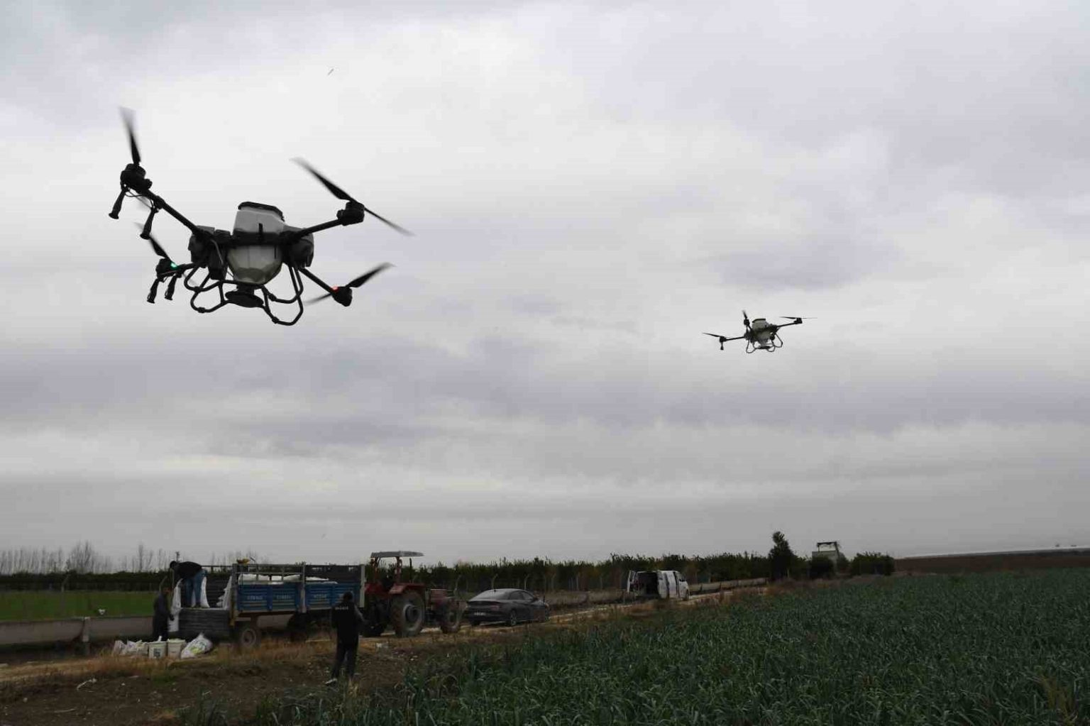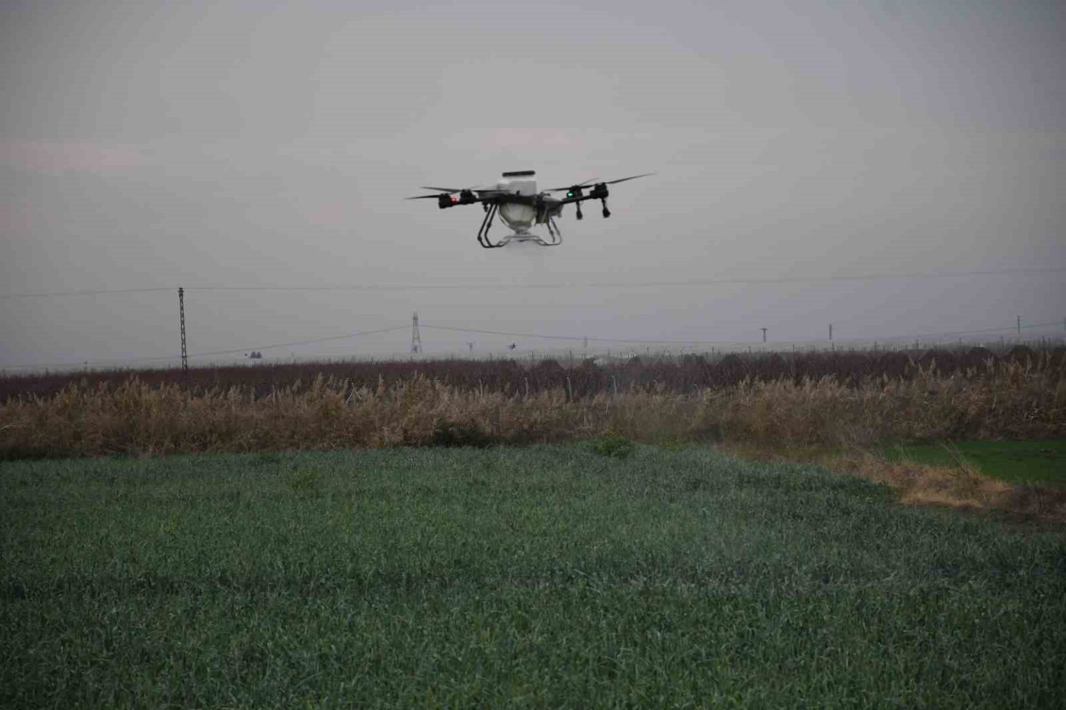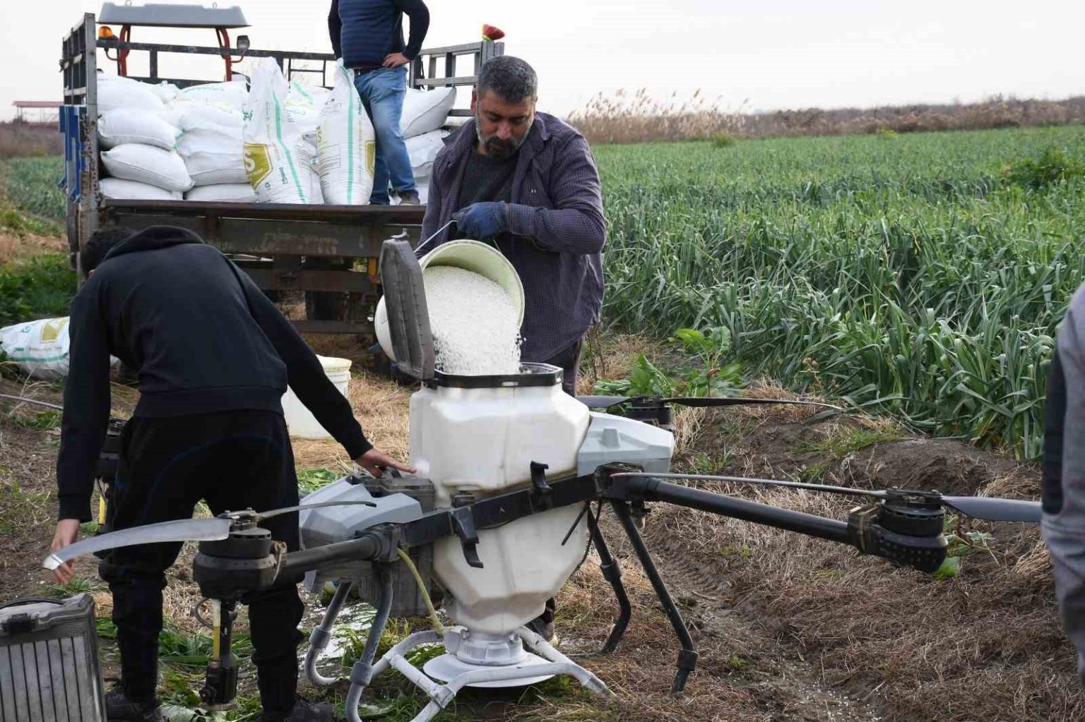 Bu çerçevede Mersin’in Tarsus ilçesinde bulunan 200 dönümlük pırasa tarlasında dronla gübreleme çalışması gerçekleştirildi. 50 kilo taşıma kapasiteli dronlara yüklenen gübreler, kısa sürede ve dengeli şekilde araziye uygulandı. 2 işçinin 3-4 saatte yapabileceği işi yarım saatte yapan dronun dönüm başına üreticiye ise yaklaşık 120 TL civarında maliyeti olduğu öğrenildi.
