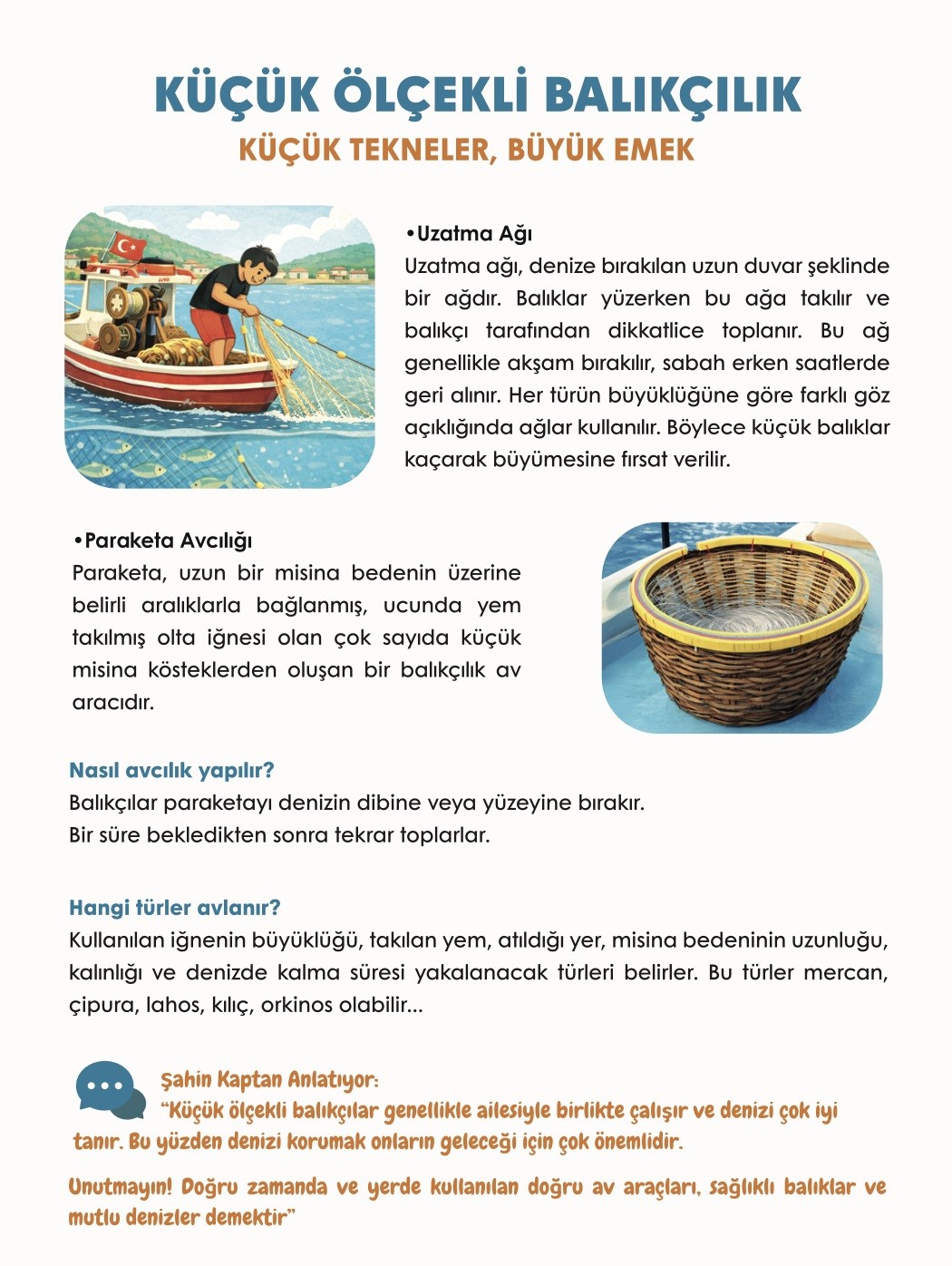 Kitap projesinin çok büyük bir emeğin sonucu olarak ortaya çıktığını ifade eden İzmir Ticaret Odası Yönetim Kurulu Üyesi Mehmet Şahin Çakan, “Kentimiz ve ülkemizin balıkçılık ve su ürünleri sektörünün gelişimine ve sorunlarının çözümüne katkı sağlamak amacıyla, kamu kuruluşları, üniversiteler, sivil toplum kuruluşları, kooperatif ve birlik temsilcileri ve su ürünleri sektöründe faaliyet gösteren sektör temsilcilerinin katılımı ile oluşturulan İzmir Balıkçılık Çalışma Komitemiz, kurulduğu 2019 yılından beri büyük bir özveri ile çalışıyor. Bu kez geleceğimizin temeli çocuklarımız için bir proje üretmekten memnuniyet duyuyoruz. Kitabımızda, denizlerimizde balık avcılığı, yetiştiricilik (çiftlik balıkçılığı), balıkların soframıza ulaşıncaya kadar geçirdiği aşamalar ve çeşitli balık türleri görseller eşliğinde anlatılıyor. Özellikle denizlerin geleceğimiz olduğu vurgulanarak, kurallara uygun avcılığın ve sürdürülebilir balıkçılığın önemi ele alındı” dedi.