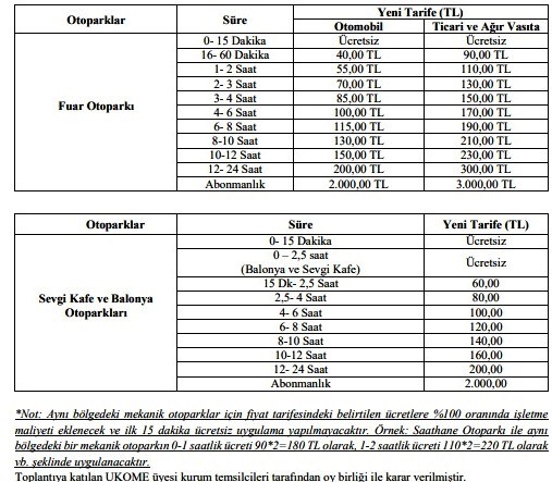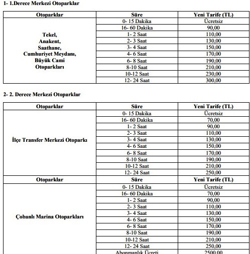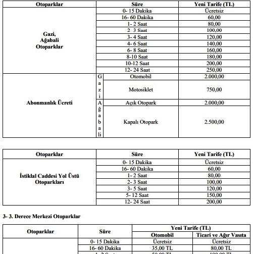 Üçüncü derece otoparklardan Kurtuluş Otoparkı’nda otomobiller için ilk 15 dakika ücretsiz, 16-60 dakika 35 TL, 12-24 saat ise 200 TL. Fuar Otoparkı’nda 16-60 dakika 40 TL, 12-24 saat 200 TL, Sevgi Kafe ve Balonya Otoparkı’nda ise ilk 15 dakika ücretsiz. 15 dk.-2,5 saat arası 60 TL ve 12-24 saat arası ise 200 TL olarak açıklandı.