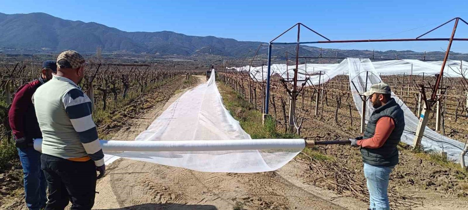 Manisa’nın Sarıgöl ilçesinde üzüm üreticileri, bağlarını dolu tehlikesine karşı korumak için örtü çalışmalarını hızlandırdı. İlçede kurulan ekipler, bağları dolu fileleriyle kaplayarak ürün kaybını önlemeyi amaçlıyor.