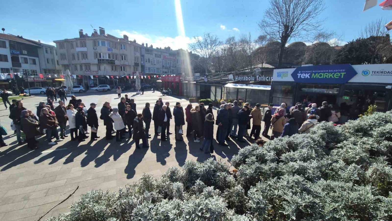 Tekirdağ Büyükşehir Belediyesi’nin dar gelirli vatandaşlara destek amacıyla başlattığı Tek Market uygulamasında kıyma 650 TL, kuşbaşı et 700 TL’den satışa sunuluyor. Bu fiyatların piyasadaki ortalama et fiyatlarının altında olması nedeniyle satış noktasında uzun kuyruklar oluşuyor.