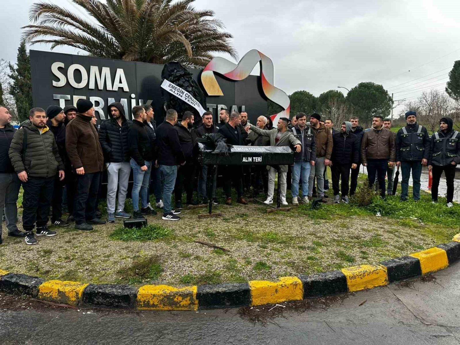 TORKU tarafından işletilen Soma Termik Santrali’nde örgütlü bulunan TES-İŞ Sendikası, toplu iş sözleşmesinden doğan geçmişe dönük maaş farklarının tek seferde ödenmemesine tepki gösteren işçiler santral önüne siyah tabut ve siyah çelenk bıraktı.