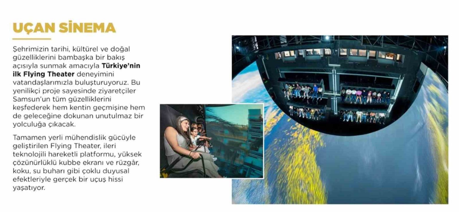 Birçok projenin hayata geçmek için gün saydığı Samsun’da Büyükşehir Belediye Başkanı Halit Doğan, sona gelen projeler hakkında bilgi verdi. Başkan Doğan, özellikle Türkiye’de ilk olma özelliği taşıyan flying theater (uçan sinema) ile vatandaşlara şehrin tarihi, kültürel ve doğal güzelliklerini bambaşka bir bakış açısıyla sunacaklarını ifade etti. Proje ile ziyaretçilerin Samsun’un tüm güzelliklerini keşfederek hem kentin geçmişine hem de geleceğine dokunan bir yolculuğa çıkacağını dile getiren Başkan Doğan, tamamen yerli mühendislik gücüyle geliştirilen uçan sinemanın; ileri teknolojili hareketli platformu, yüksek çözünürlüklü kubbe ekranı, gerçek rüzgâr, koku ve su buharı gibi çoklu efektleriyle uçuş hissi oluşturduğunu da sözlerine ekledi.