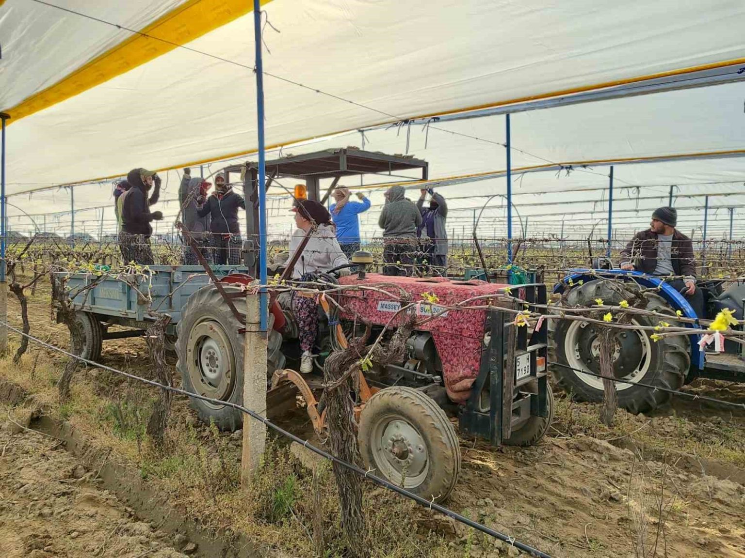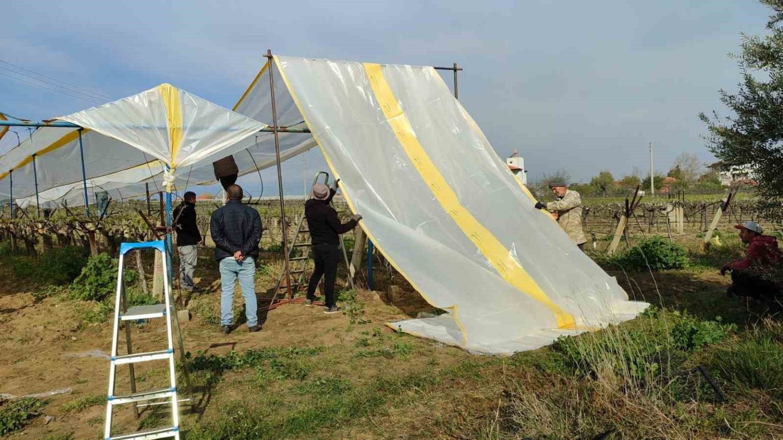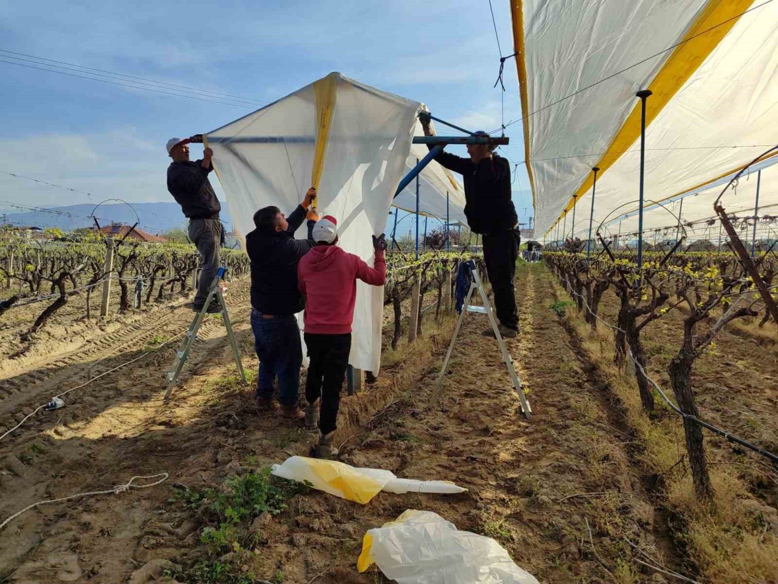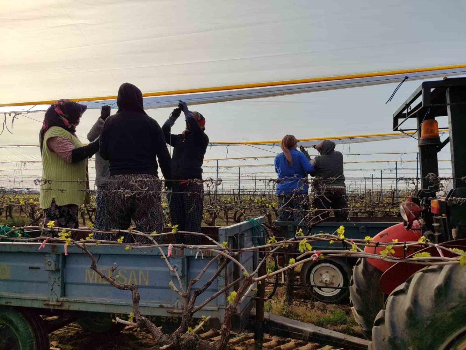 Manisa’nın üzüm üretimiyle ünlü Sarıgöl ilçesinde yeni sezon hazırlıkları başladı. Yapraklanmaya başlayan bağlar, dolu, yağmur ve soğuk havaya karşı koruma altına alınırken, üreticiler ürün kaybını önlemek için bağların üzerini dolu tülleriyle kapatıyor.