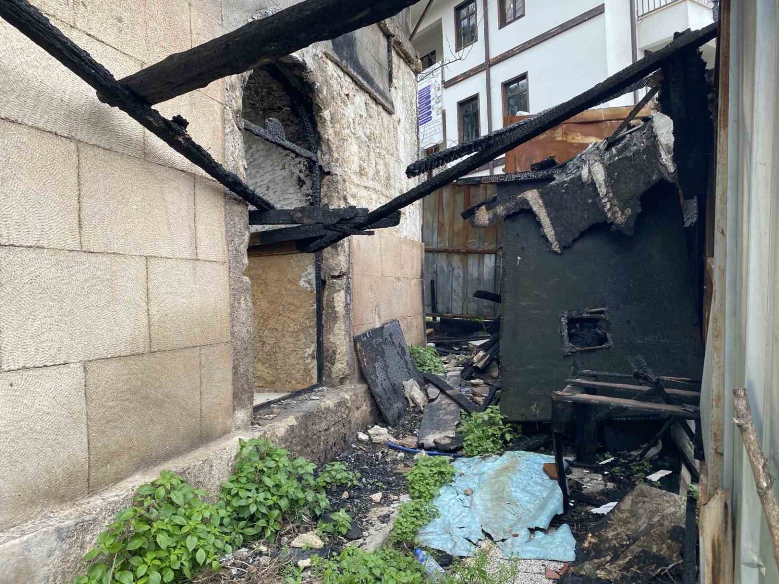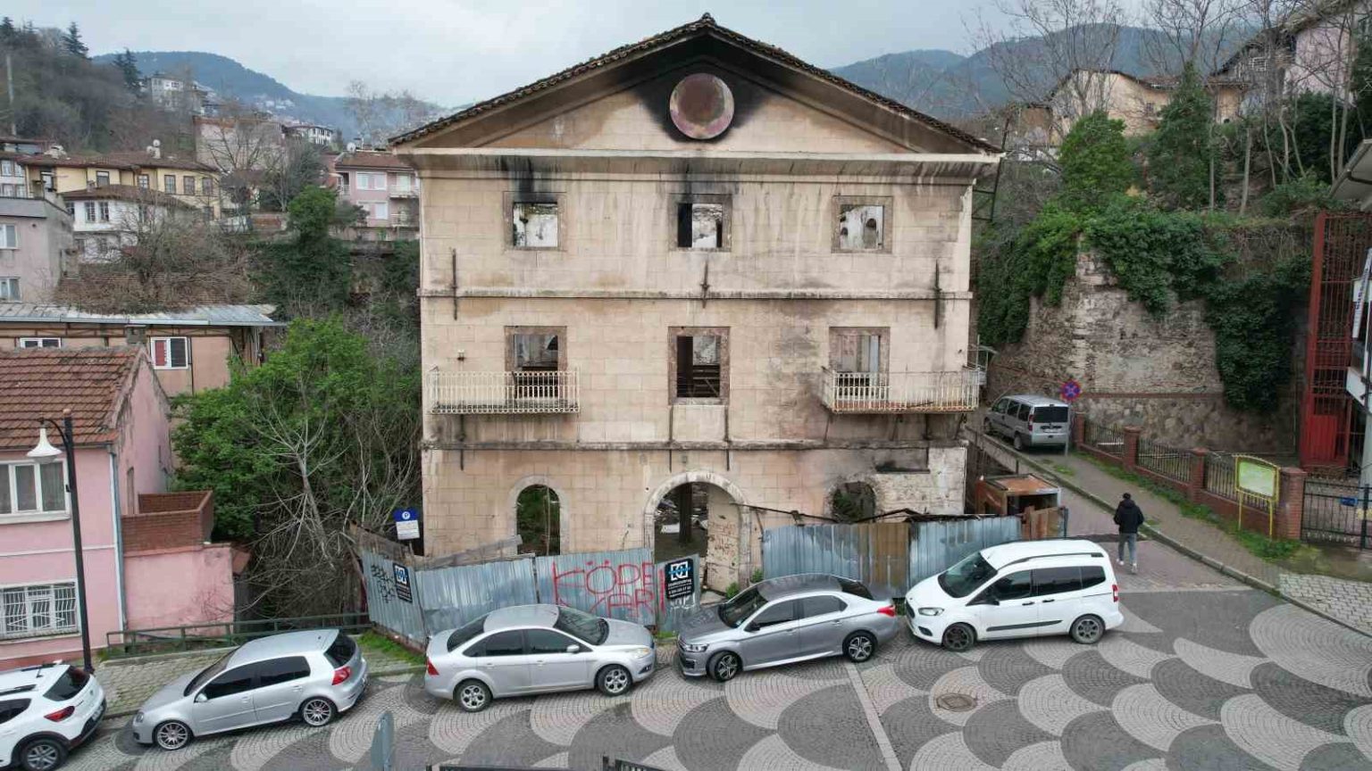 Osmangazi ilçesi Yahşibey Mahallesi’nde bulunan ve yangınla yeniden gündeme gelen tarihi binanın son durumu gün ışığında ortaya çıktı. Dron kamerasına yansıyan görüntülerde, binanın uzun süredir kullanılmadığı, camlarının kırıldığı ve iç kısmının büyük ölçüde tahrip olduğu görüldü.