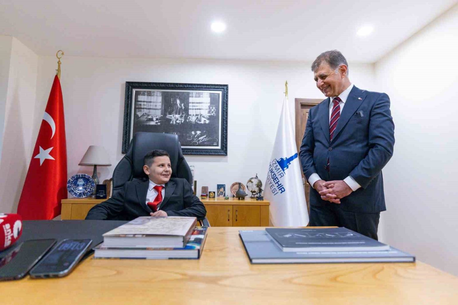 İzmir Büyükşehir Belediye Başkanı Dr. Cemil Tugay, 23 Nisan Ulusal Egemenlik ve Çocuk Bayramı’nda koltuğunu 5. sınıf öğrencisi ve İzmir Çocuk Meclisi üyesi Meryem Günay ile 4. sınıf öğrencisi Aras İpek’e devretti. Minik başkanlar, eğitimden güvenliğe uzanan talepleriyle barış, sevgi ve umut dolu bir gelecek çağrısı yaptı.