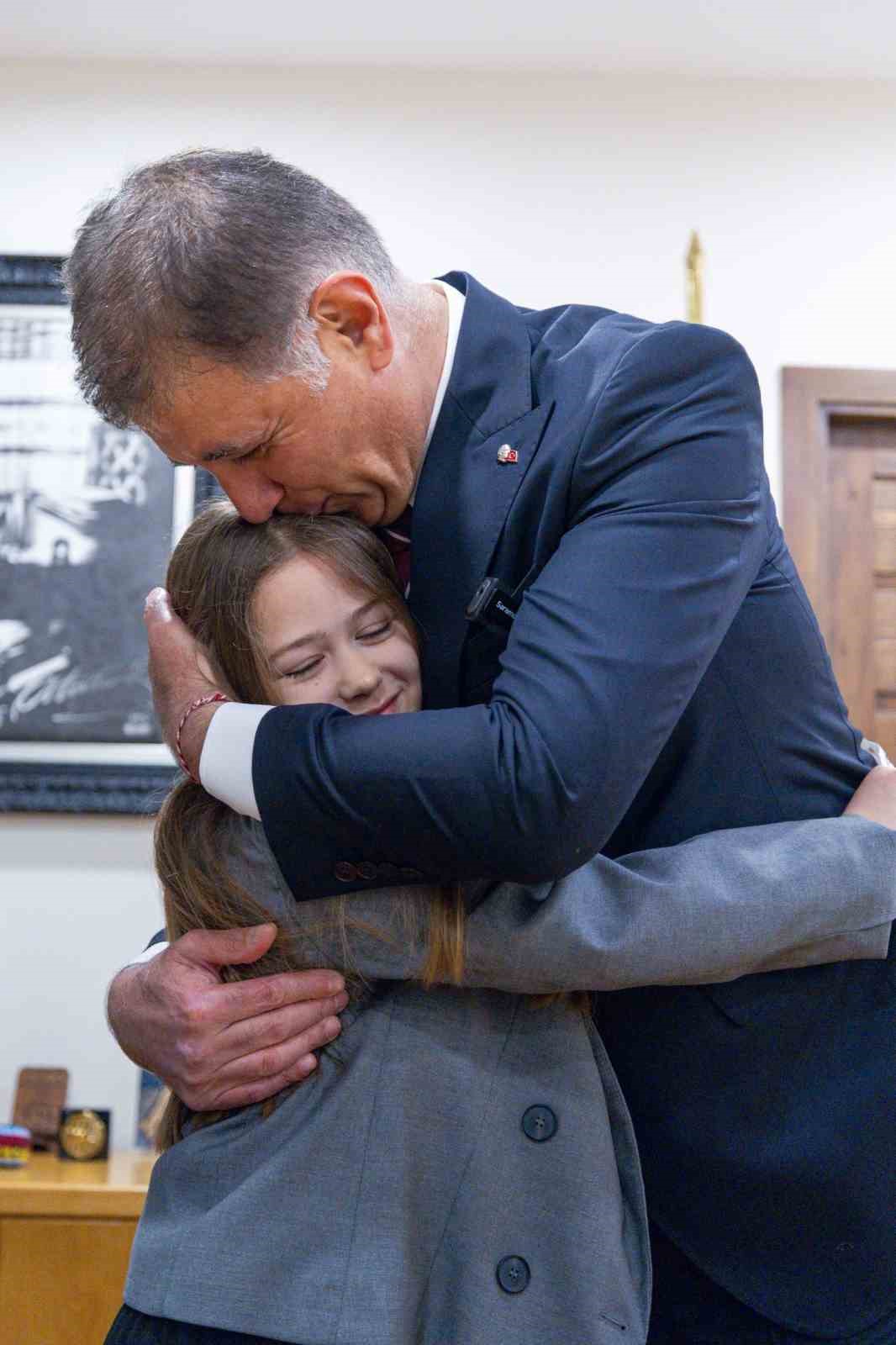 Başkan Cemil Tugay, daha sonra koltuğunu 4. sınıf öğrencisi Aras İpek’e devretti. İpek, “Bu bayram çocuklara armağan edilmiş bir bayram. Mustafa Kemal Atatürk bu bayramı çocuklara bıraktı; çünkü çocuklar yarının geleceği. Bu yüzden çocuklara sahip çıkmalıyız. Okul saldırılarında çocukların ölmemesini sağlamalıyız” dedi.