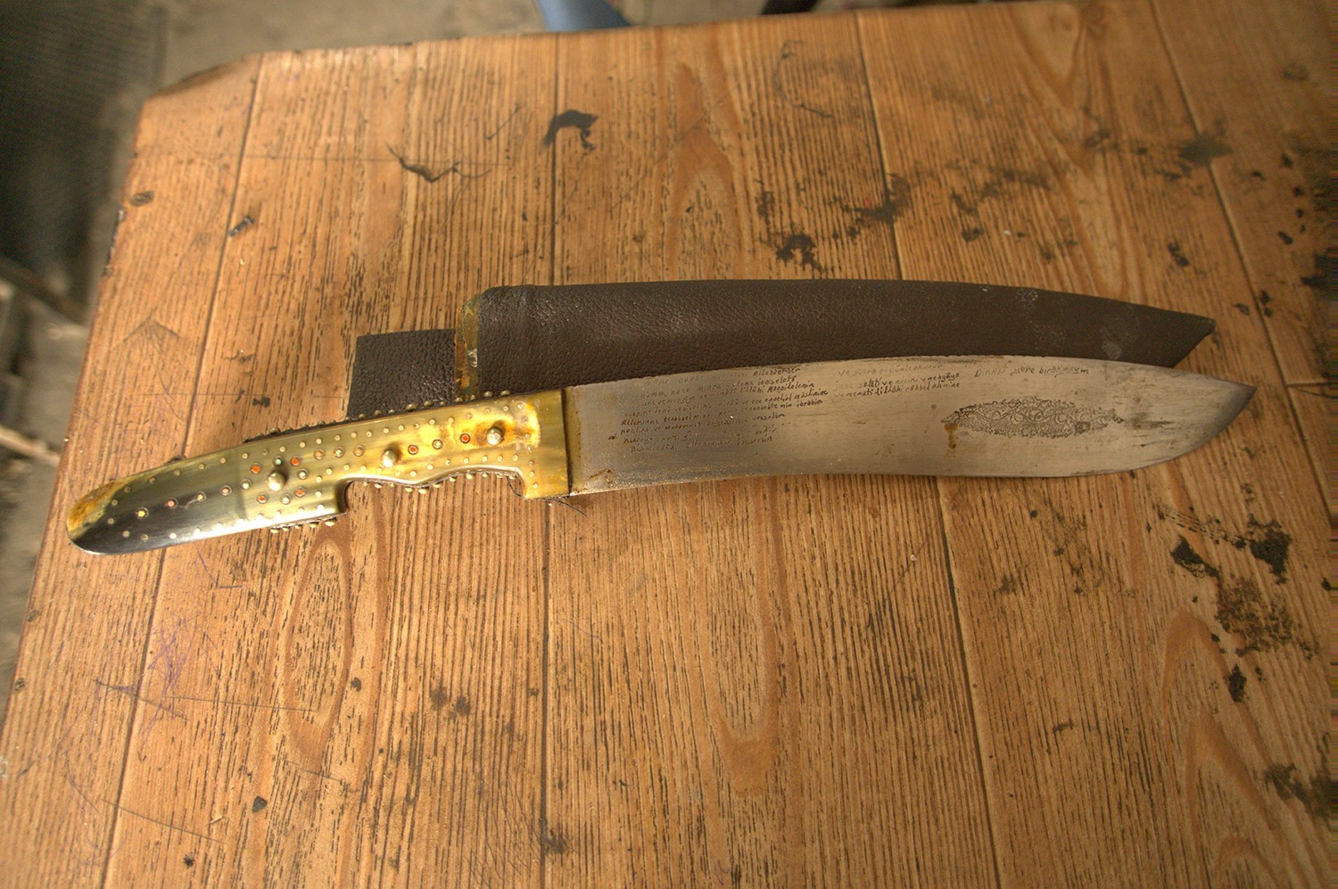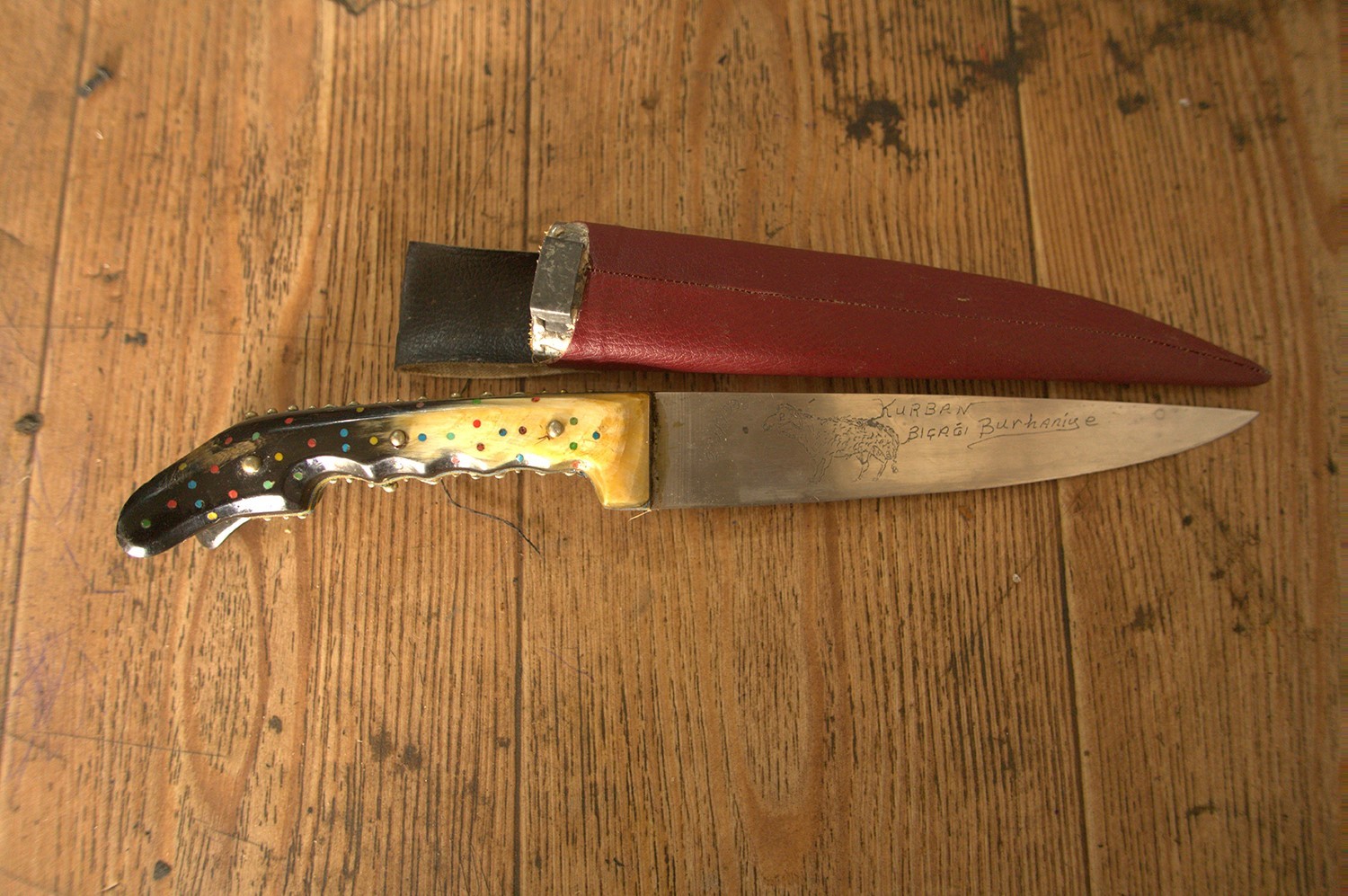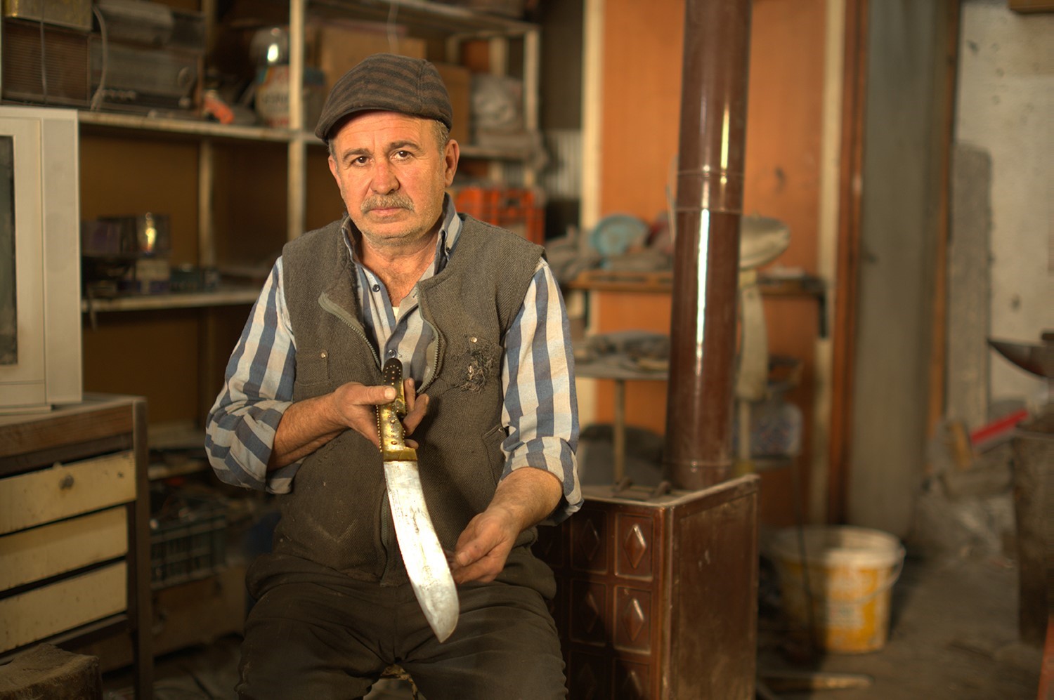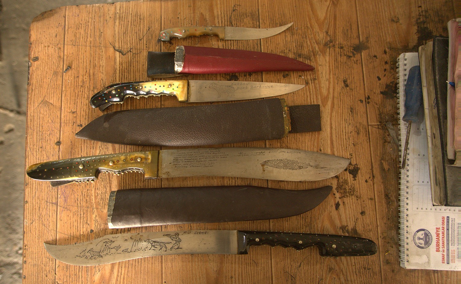 Usta Tanju Pulat’ın atölyesindeki en dikkat çekici parça, babasının 1974 yılında çeliğini elleriyle dövdüğü kurban satırı. Yarım asrı devirmesine rağmen keskinliğinden hiçbir şey kaybetmeyen satırın özelliğini açıklayan Pulat, “Bu satır yapıldığı günden bu yana birçok kurban kesip parçaladı. Hala ilk gün ki gibi bir kez bile bileme yüzü görmedi. Eski ustaların çeliğe su verme ve dövme tekniği böyle belli oluyor. Biz hala bu satırı bilemedik. İlk günkü gibi kullanıyoruz” dedi.