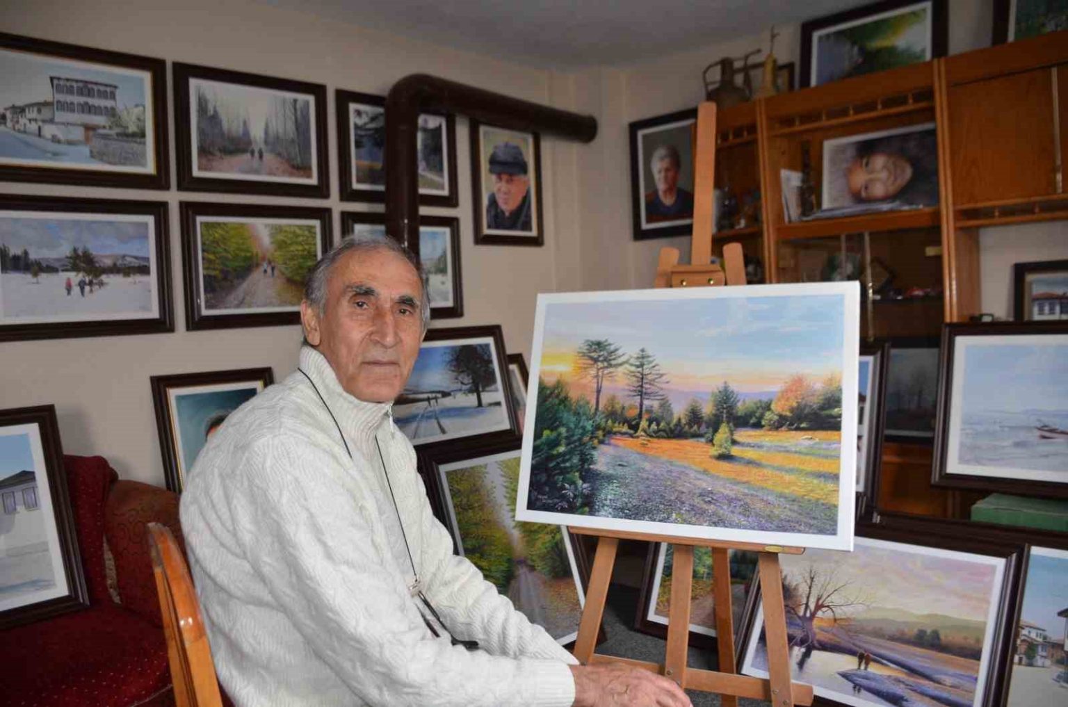 Bilecik’in Osmaneli ilçesinde emekli olduktan sonra 10 metrekare atölyede resim tuvaline hayat veren Necmi Öztürk, 55 yıldır resimlerini severek yapıyor. 72 yaşındaki Necmi Öztürk ilkokulun mezunu olduğunu ve hiçbir resim eğitimi almadığını anlatarak, “Ben ilkokulda resmi çok güzel yapıyordum ve daha sonra herkese resimler yapmaya başladım. Öğretmen tahtaya bir şey koyuyordu, bunun resmini yapın diyordu. Ben o zamandalar babamın iflasından dolayı resim defteri alacak durumum yoktu ve herkes bir sayfa veriyordu. Ben de onlara resim yapıyordum. Sonra öğretmenlerim ilçemize İstanbul’dan üniversiteden gelen akademisyenlere beni anlattı. Resimlerimi görünce çok beğendiler ve beni İstanbul’a götürdüler. Orada bir ressamın yanında çalışmaya başladım. Gittiğimiz arkadaş asistandı, daha sonra hocam doçent oldu, profesör oldu. Onun yanında yıllarca çalıştım. Emekli olunca, kendisi vefat edince, Osmaneli’ne tekrar geri döndüm, atölye açtım” dedi.