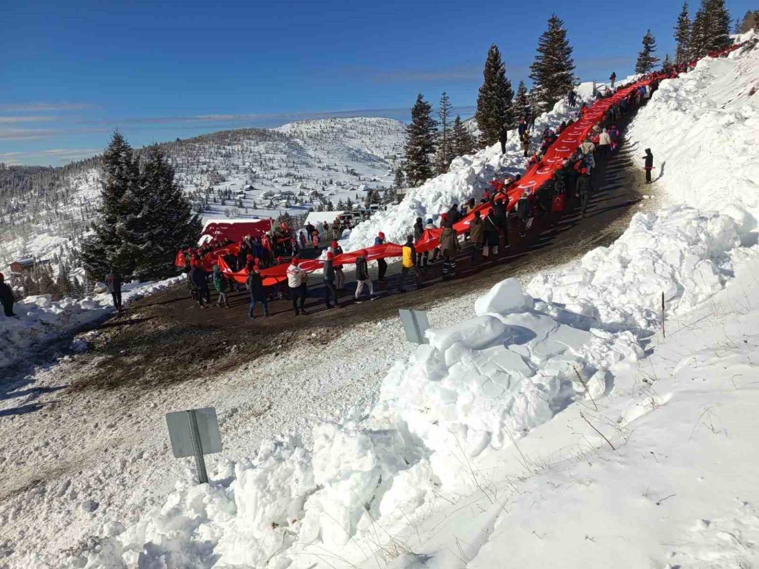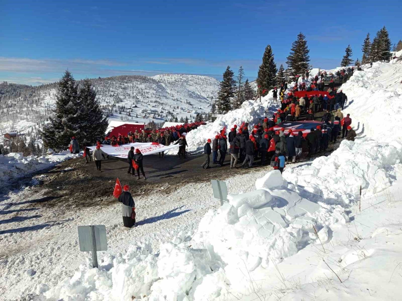Sis Dağı Hanyanı Mevkiinde toplanılmasın ardından katılımcılar tekbirler eşliğinde ve 350 metrelik Türk Bayrağı ile 2 bin 187 rakımlı Sis Dağı’na yürüdüler.