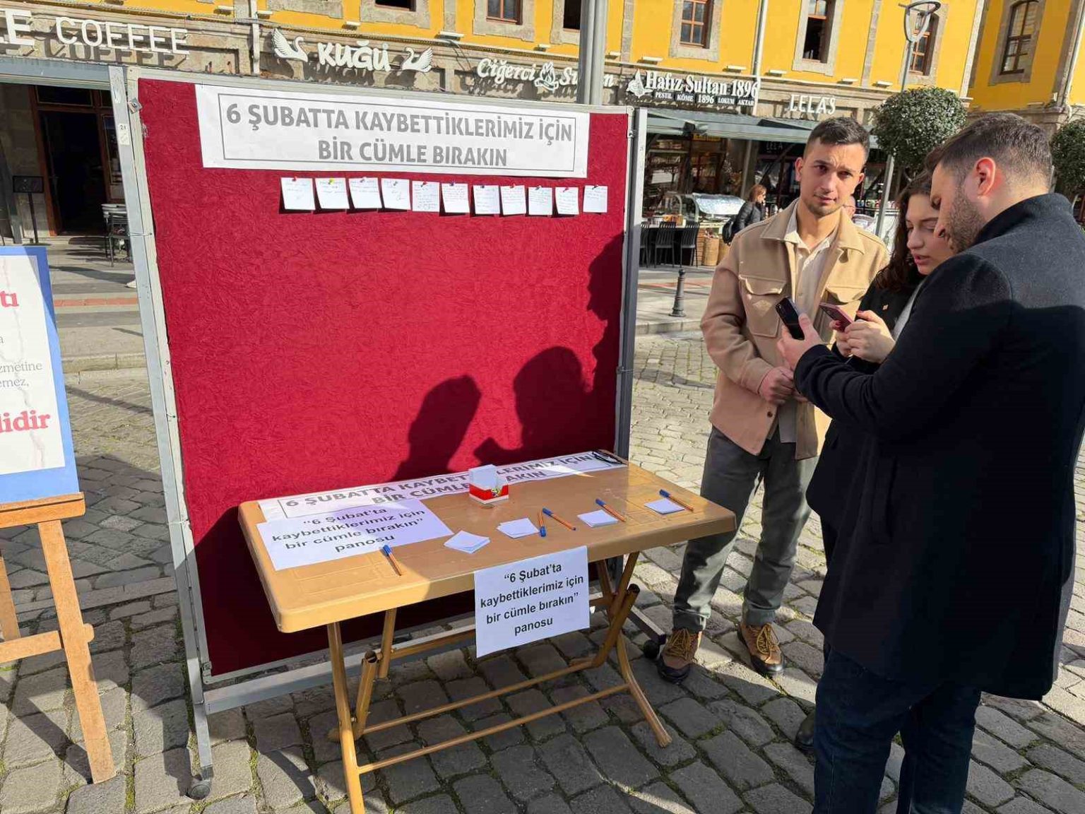 Katılımcılar, depremde ölenleri anmak için alanda kurulan ’6 Şubat’ta kaybettiklerimiz için bir cümle bırakın’ başlıklı panoya, duygularını yazdıkları not kağıtları yapıştırdı.