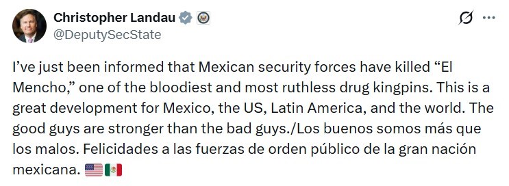 ABD Dışişleri Bakanı Yardımcısı Christopher Landau, Meksika’daki Jalisco Yeni Nesil Karteli (CJNG) lideri “El Mencho” lakaplı Nemesio Oseguera’nın düzenlenen askeri operasyon sırasında öldürülmesi hakkında, “Bu Meksika, ABD, Latin Amerika ve dünya için harika bir gelişme” açıklamasında bulundu.