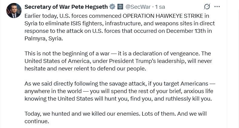 ABD Savunma Bakanı Pete Hegseth ise, sosyal medya platformu X üzerinden yaptığı açıklamada ABD’nin bugün erken saatlerde Suriye’de “Hawkeye Strike Operasyonu”nu (Şahin Gözü Operasyonu) başlattığını duyurdu. Bu operasyonun 13 Aralık’ta Suriye’nin Tedmur (Palmira) bölgesinde ABD güçlerine yönelik gerçekleştirilen saldırıya doğrudan bir yanıt olduğunun altını çizen Hegseth, “Operasyon, DEAŞ savaşçılarını, altyapısını ve silah mevzilerini ortadan kaldırmayı amaçlamaktadır” dedi. Bu operasyonun bir savaş başlangıcı değil, intikam ilanı olduğunu kaydeden Hegseth, “Başkan Trump’ın liderliği altındaki ABD, halkını savunma konusunda asla tereddüt etmeyecek ve asla geri adım atmayacaktır” ifadelerini kullandı. ABD’yi ve halkını hedef alan herkesin dünyanın neresinde olursa olsun bulunup yok edileceğini vurgulayan Hegseth, “Bugün düşmanlarımızı avladık ve öldürdük. Hem de çok sayıda. Ve buna devam edeceğiz” dedi.