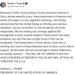 ABD Başkanı Donald Trump, Suriye’de 2’si asker 3 ABD vatandaşının hayatını kaybettiği saldırıya yanıt verildiğini belirterek, “DEAŞ’ın Suriye’de cesur Amerikalı vatanseverleri vahşice katletmesi nedeniyle, bu saldırının sorumlusu olan katil teröristlere karşı, söz verdiğim gibi, ABD’nin çok ciddi bir misilleme yaptığını buradan ilan ediyorum” açıklamasında bulundu.